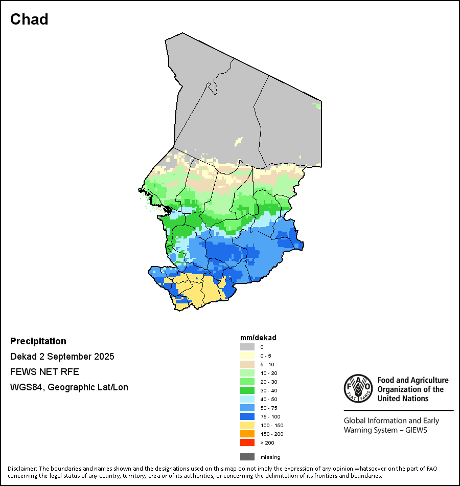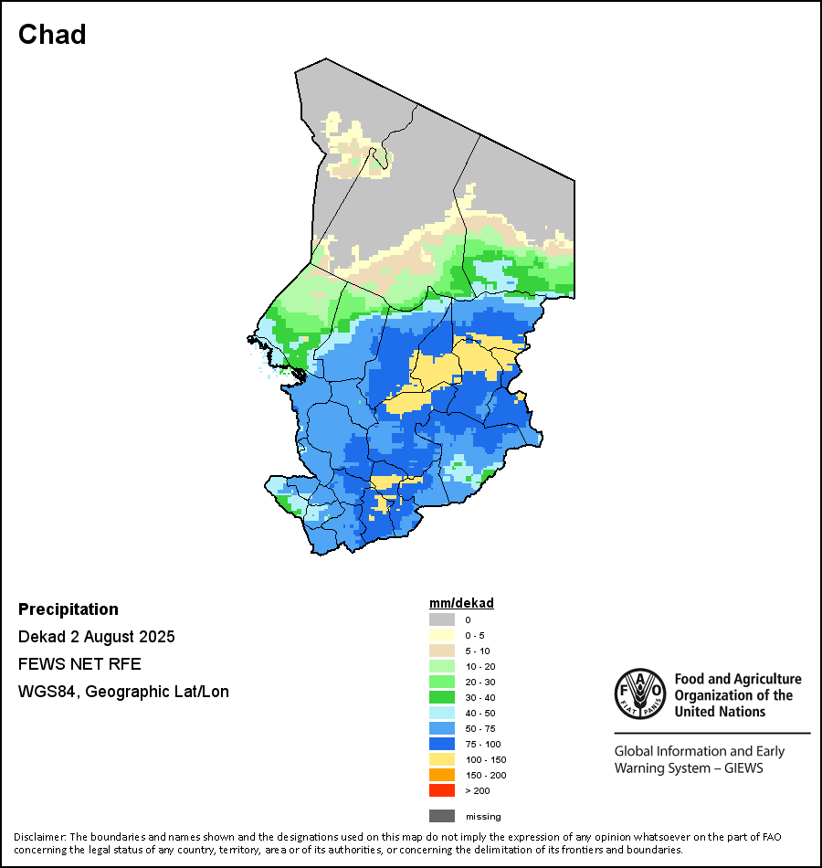 The map depicts cumulative rainfall volumes over a dekad (a 10-day period). Precipitation estimates for all African countries (except Cabo Verde and Mauritius) are taken from NOAA/FEWSNet, while for the remaining countries data is obtained from ECMWF.