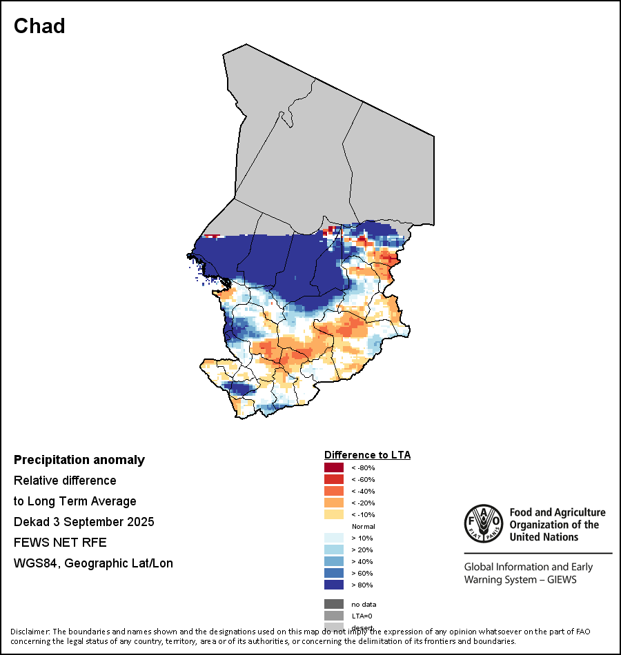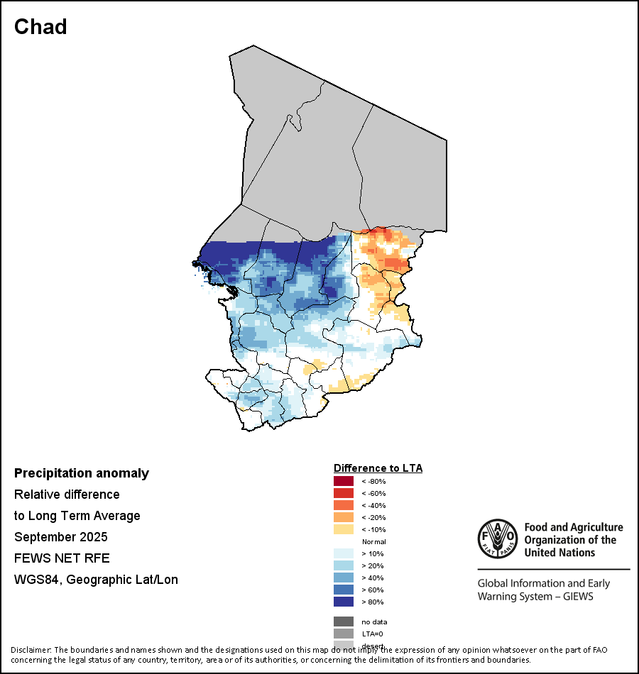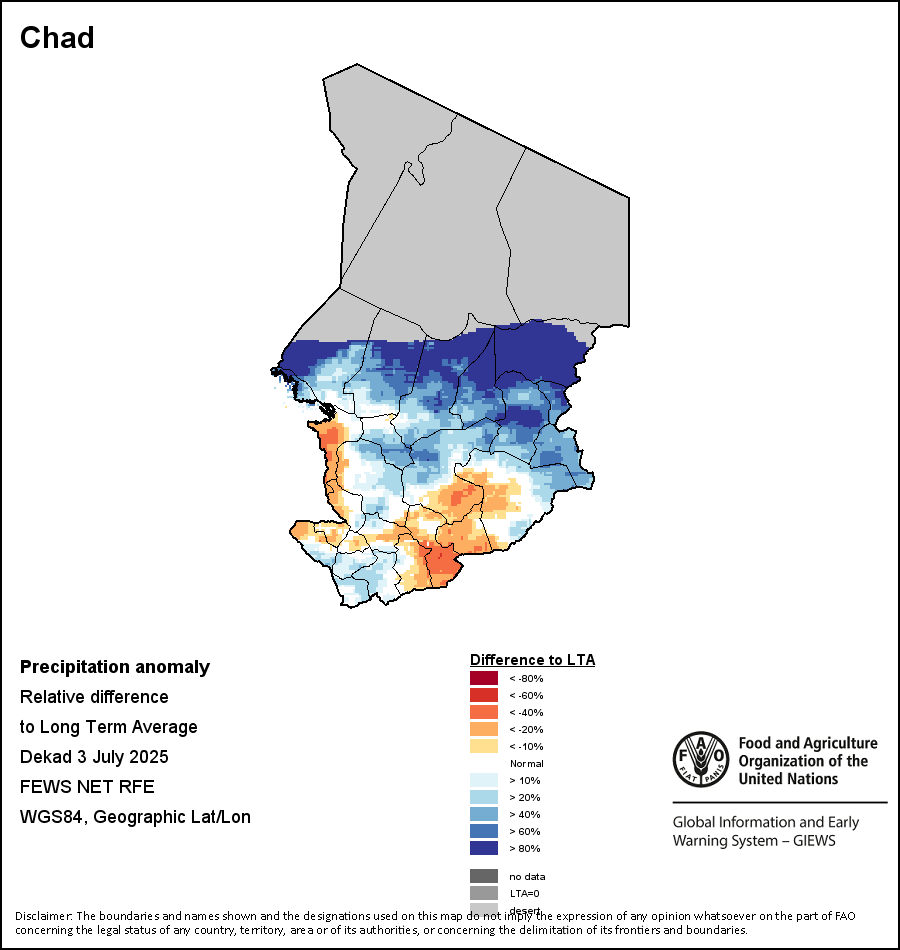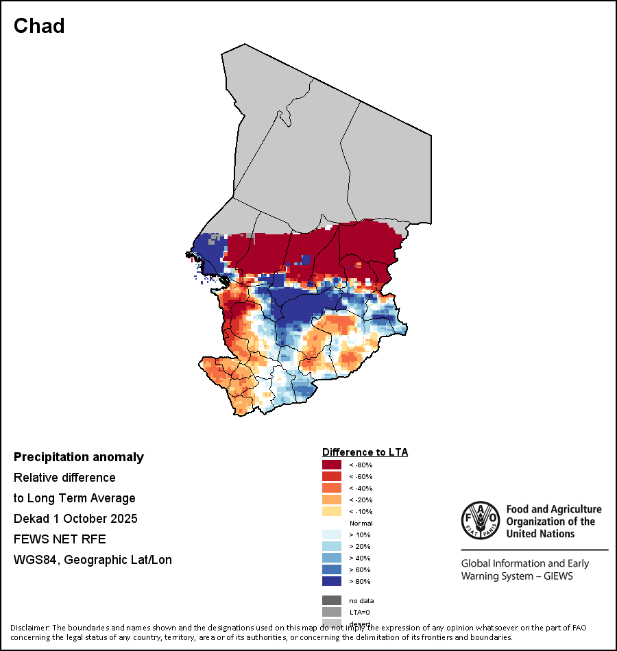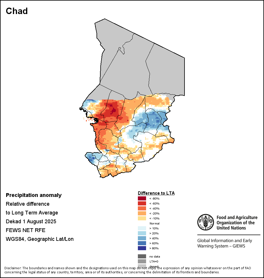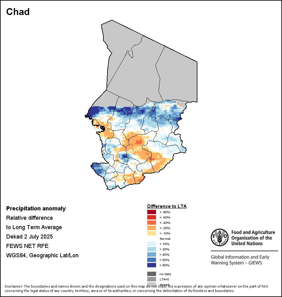 The map illustrates the difference between the current rainfall volume and the average level. Rainfall levels are compared with the Long-Term Average (LTA), which refers to the period 1989-2015. Warmer colours identify areas which have received lower-than-average rainfall, while colder colours are given to areas where precipitation has been above average.