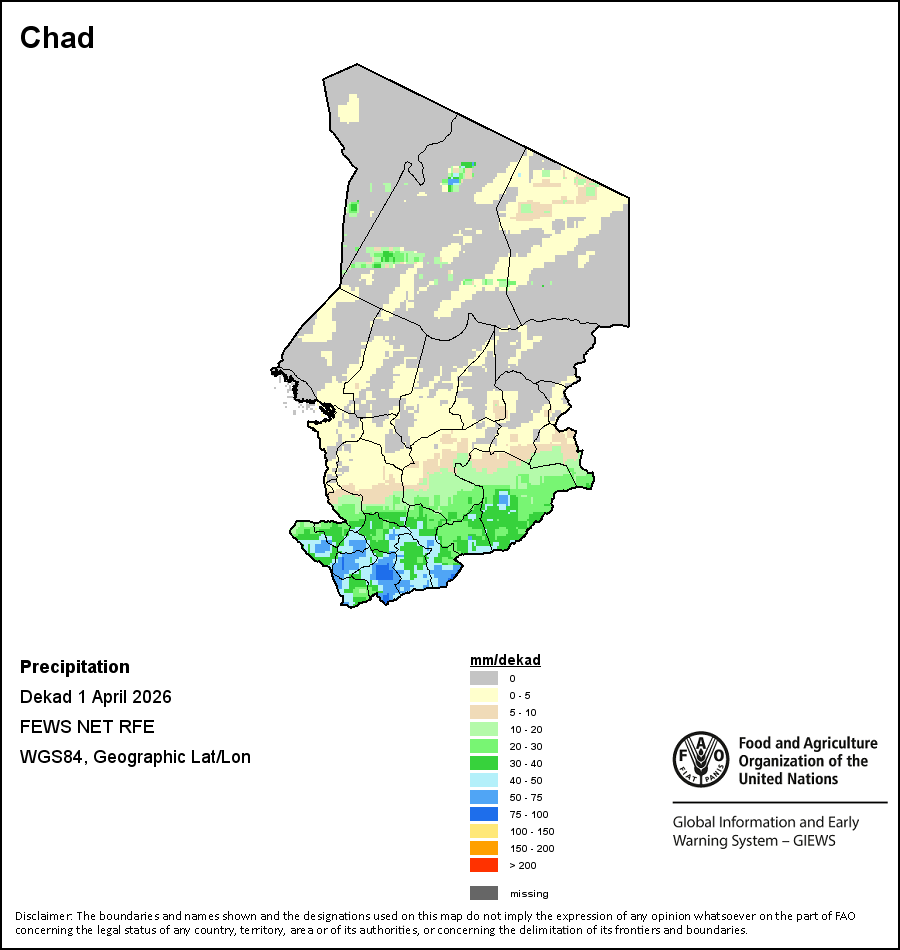 该图谱显示了每一旬(十天)的累积降水量。 所有非洲国家的降水量估算(除佛得角和毛里求斯外)均取自NOAA/FEWSNet,其他国家则取自ECMWF。