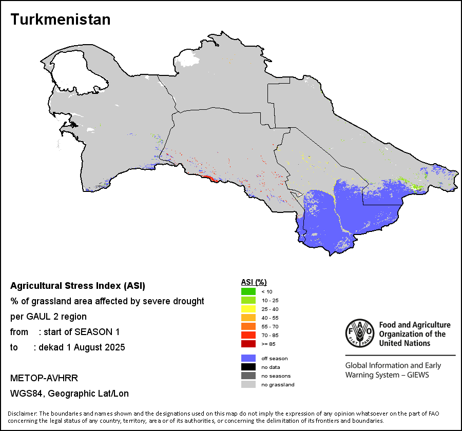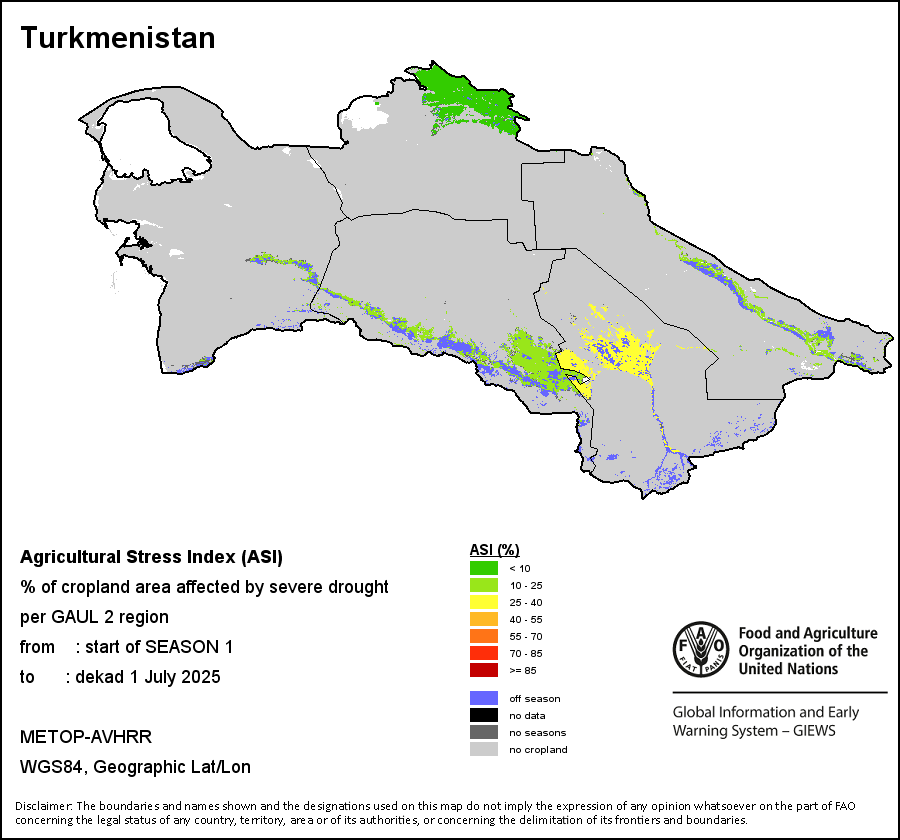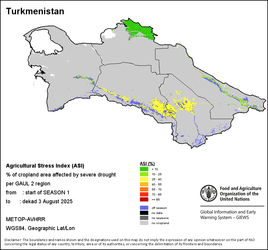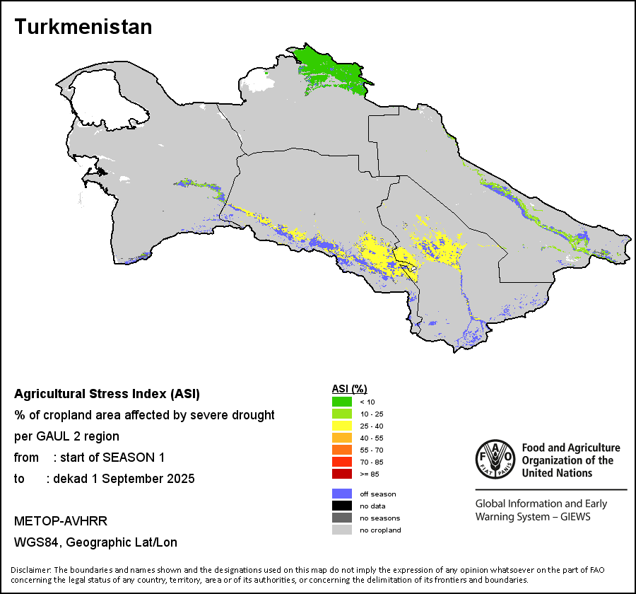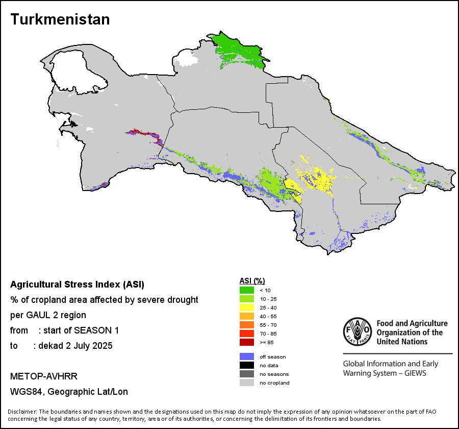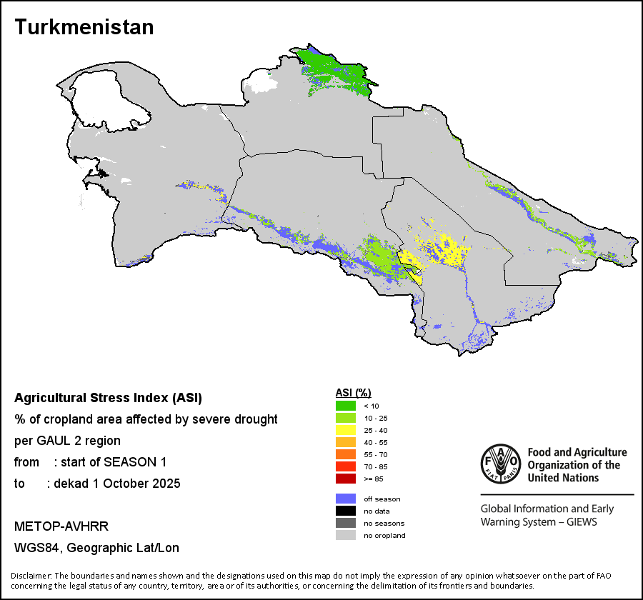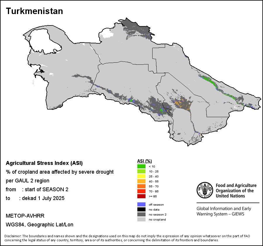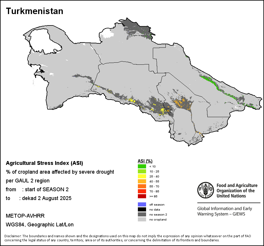 农业干旱胁迫指数(ASI)是一项速览指数,有助于在早期甄别较大可能发生水胁迫(干旱)的耕地。 该指数通过整合植被健康指数(VHI)在评估农业旱情方面具有关键意义的两个维度,即时间和空间维度,而得出。计算农业干旱胁迫指数的第一步是求植被健康指数的时间平均值,对作物周期内旱情的强度和时长进行像素级评估;这项计算包括采用作物系数衡量某种作物在各物候阶段对干旱胁迫的敏感度。第二步是确定旱情的空间广度,方法是计算植被健康指数值低于35%(Kogan前期研究将这一数值确定为评估干旱程度的临界值,1995年)的耕地的像素百分比。然后把各个行政区域根据受影响面积的百分比进行划分,便于对结果进行快速解读。