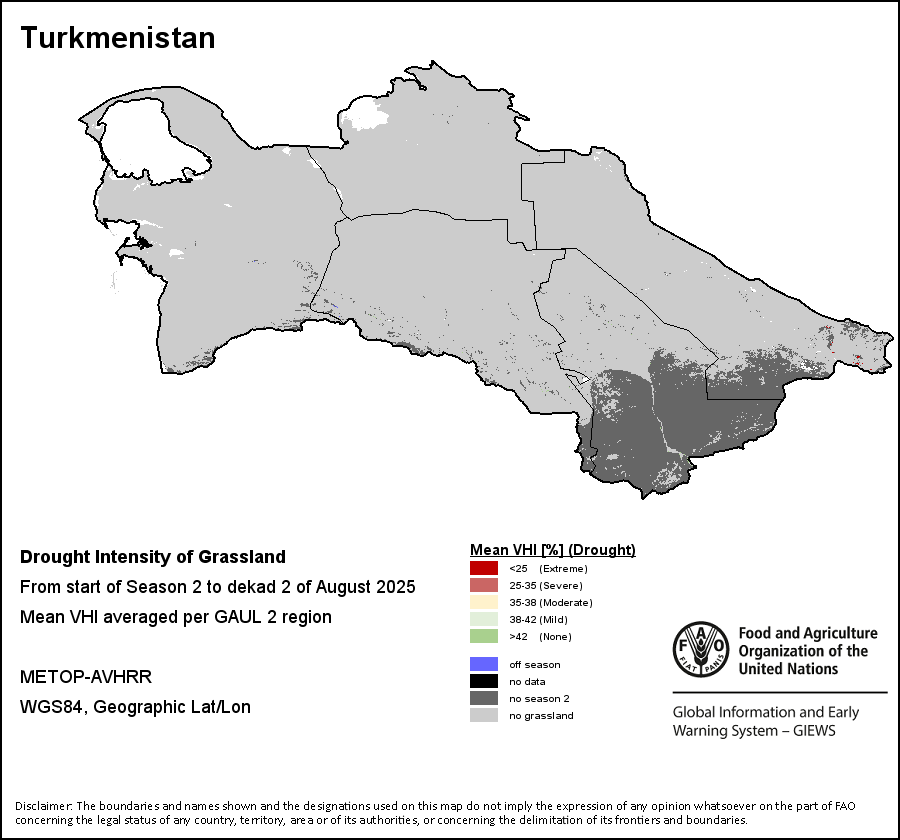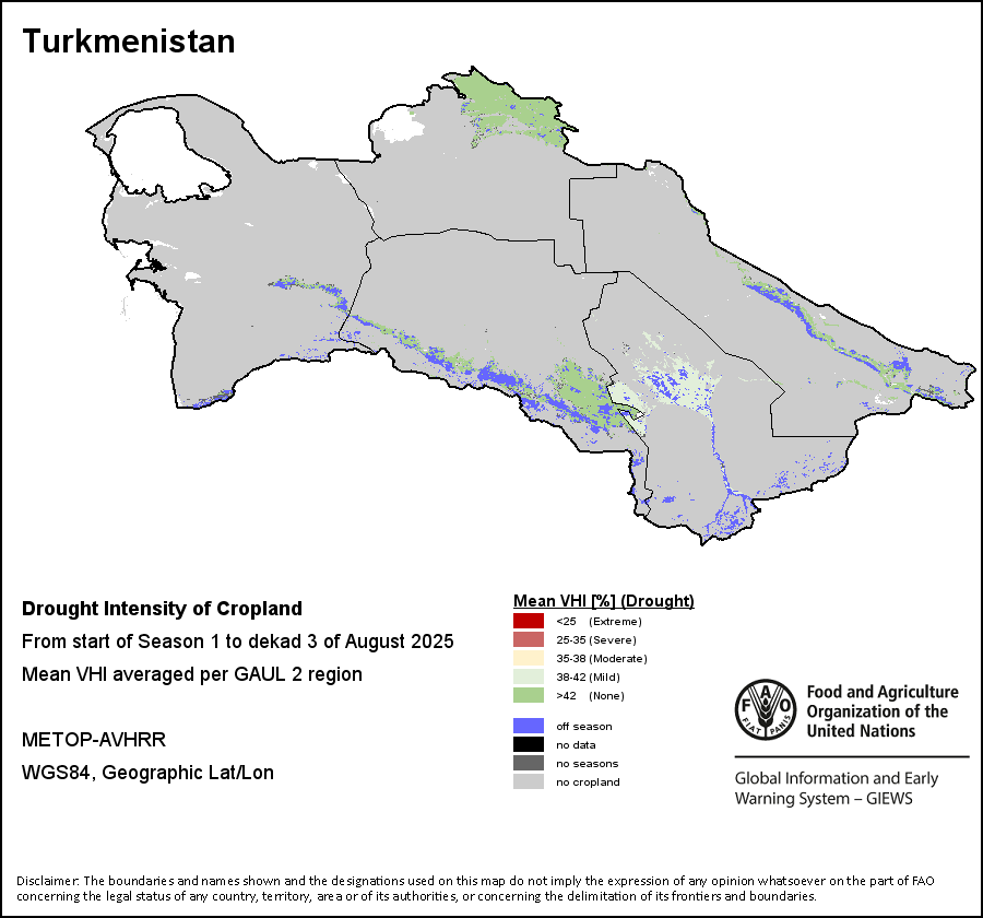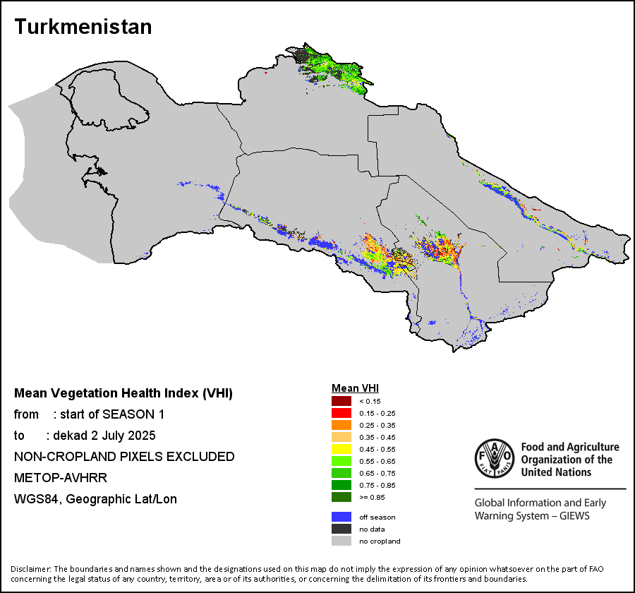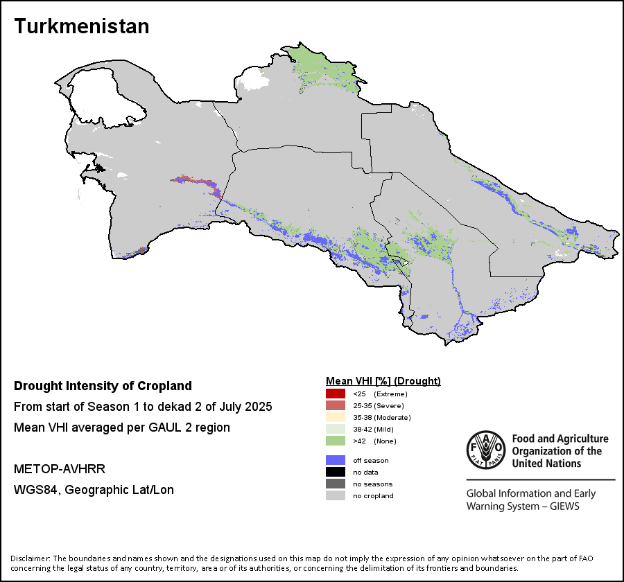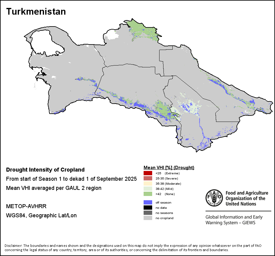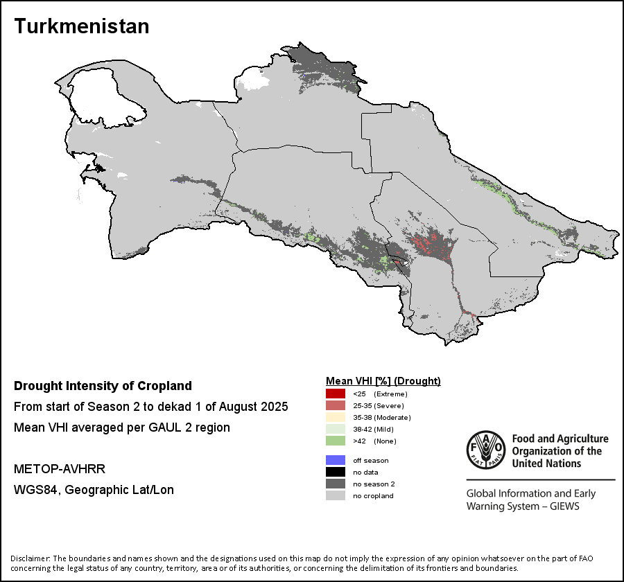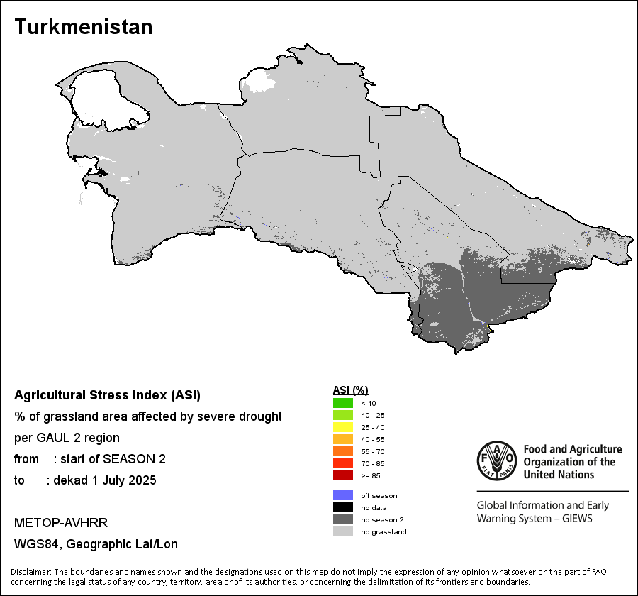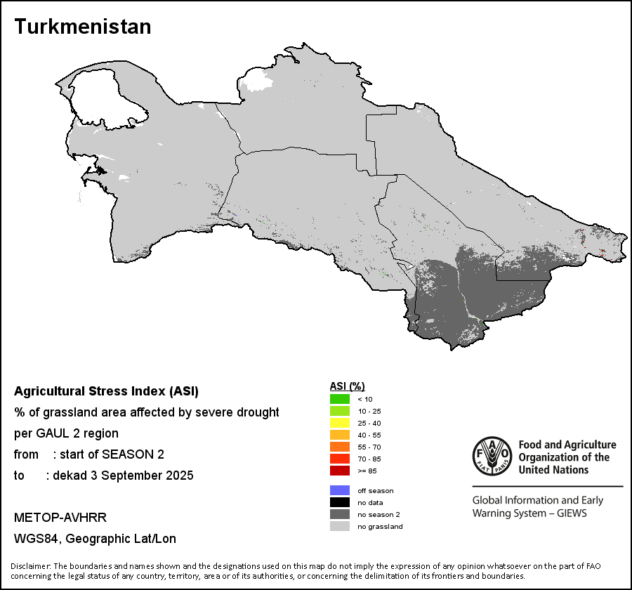 农业干旱胁迫指数(ASI)是一项速览指数,有助于在早期甄别较大可能发生水胁迫(干旱)的耕地。 该指数通过整合植被健康指数(VHI)在评估农业旱情方面具有关键意义的两个维度,即时间和空间维度,而得出。计算农业干旱胁迫指数的第一步是求植被健康指数的时间平均值,对作物周期内旱情的强度和时长进行像素级评估;这项计算包括采用作物系数衡量某种作物在各物候阶段对干旱胁迫的敏感度。第二步是确定旱情的空间广度,方法是计算植被健康指数值低于35%(Kogan前期研究将这一数值确定为评估干旱程度的临界值,1995年)的耕地的像素百分比。然后把各个行政区域根据受影响面积的百分比进行划分,便于对结果进行快速解读。