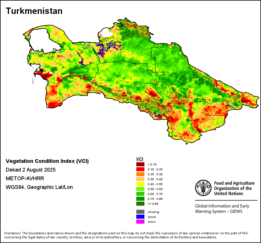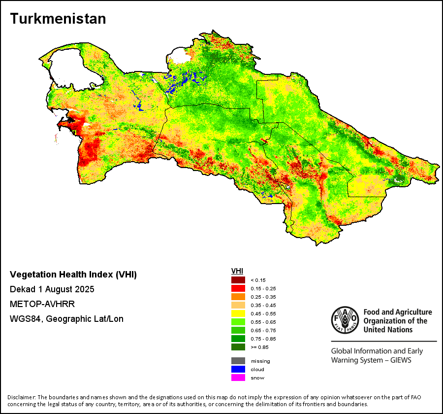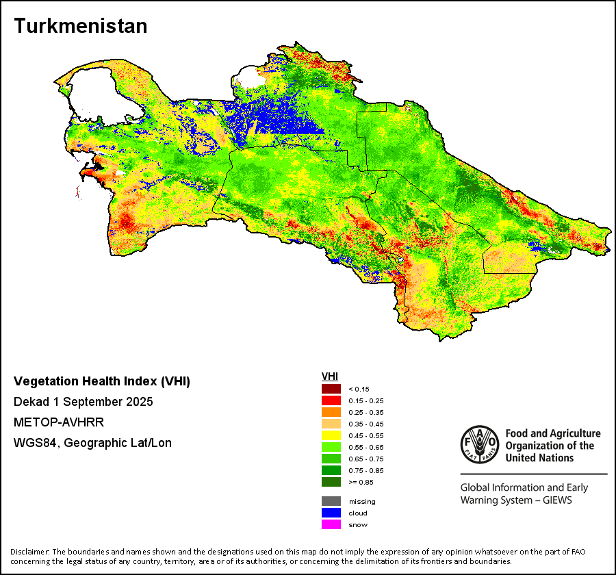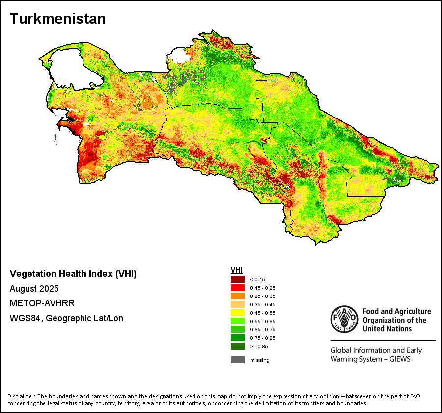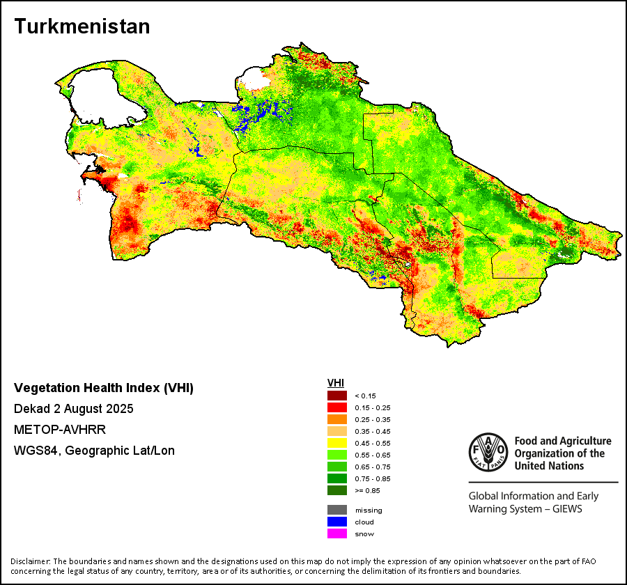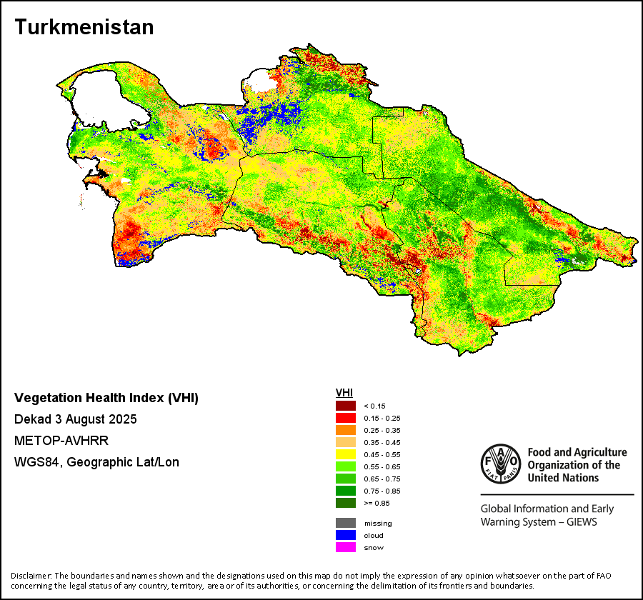 植被健康指数(VHI)根据植被健康状况以及气温对作物状况的影响情况显示干旱的严重程度。 VHI是一项综合指数,是用于计算ASI的基础性指标。它结合了植被状况指数(VCI)和气温状况指数(TCI)。TCI的计算采用了与VCI类似的方程,但它把当前气温与长期最高和最低值联系起来,因为一个假定前提是气温越高就倾向于造成植被状况恶化。比方说,VHI指数下降就意味着植被状况相对较差,而气温越高则意味着植被状况受到胁迫,较长时间延续则成为干旱的指征。VHI映像针对两个主要季节进行计算并分为三种时间模式:旬度、月度和年度。