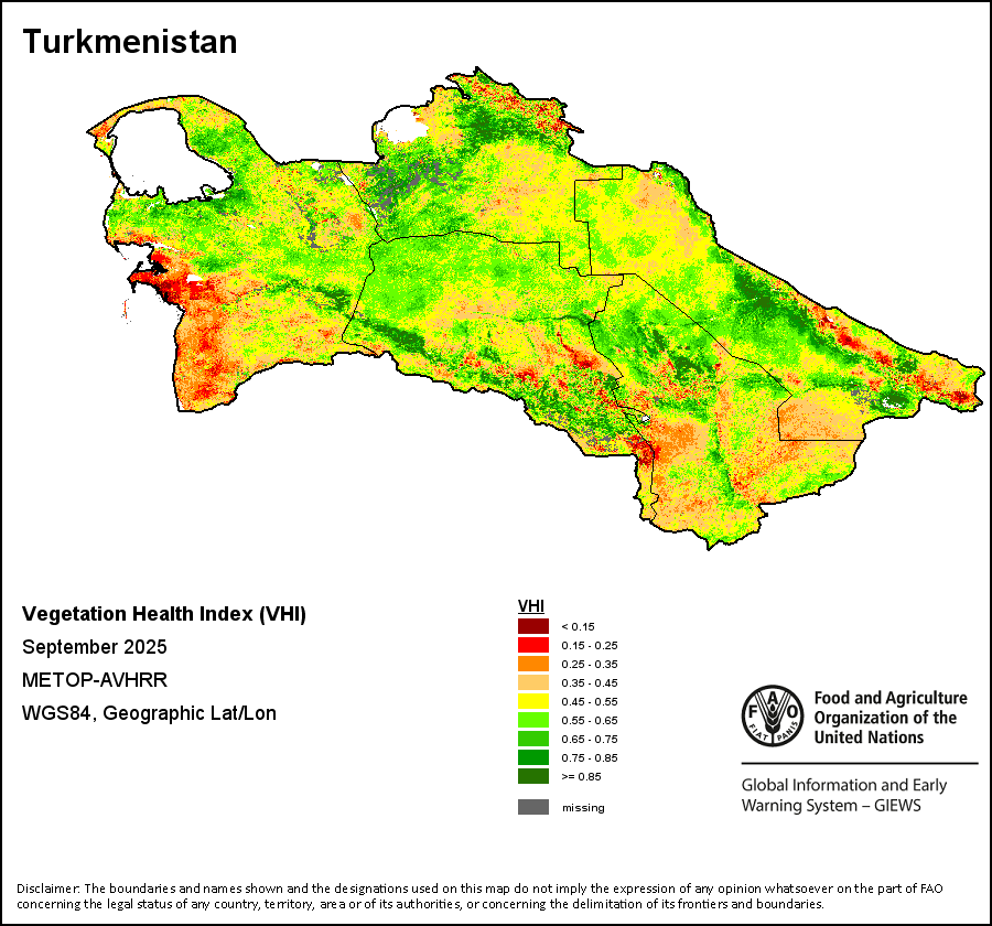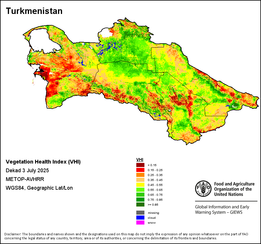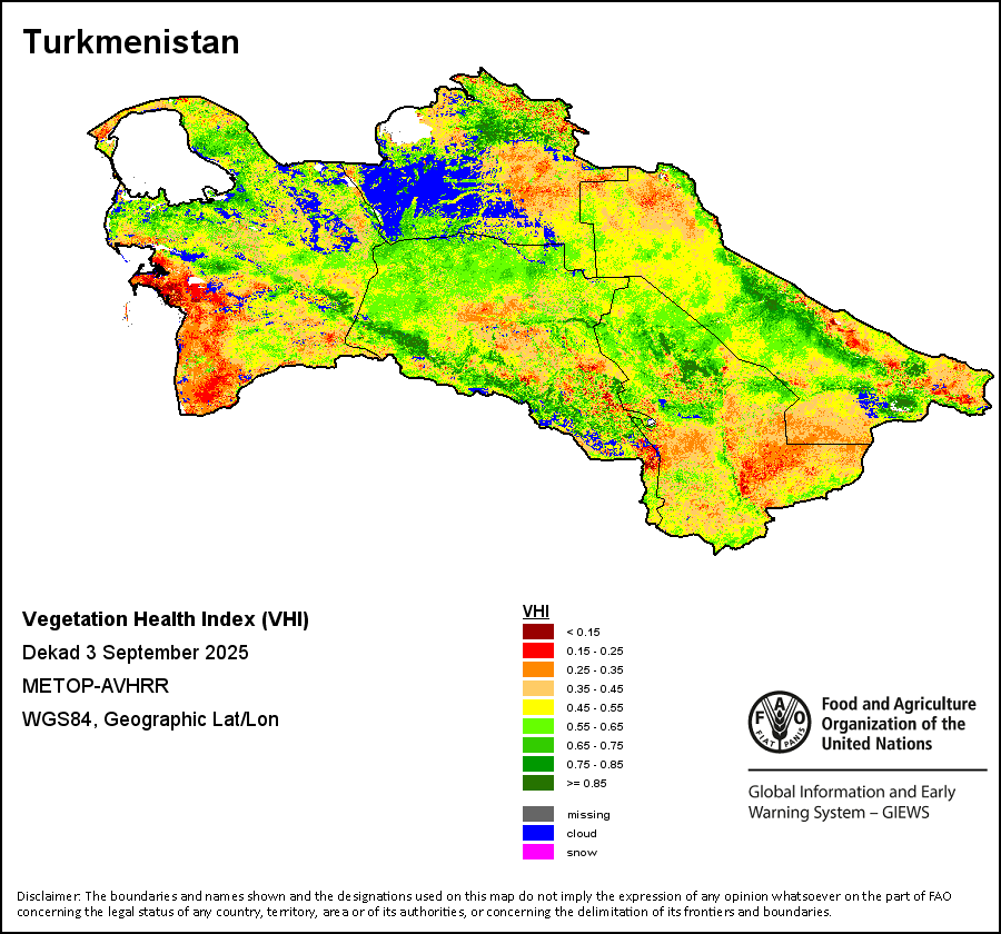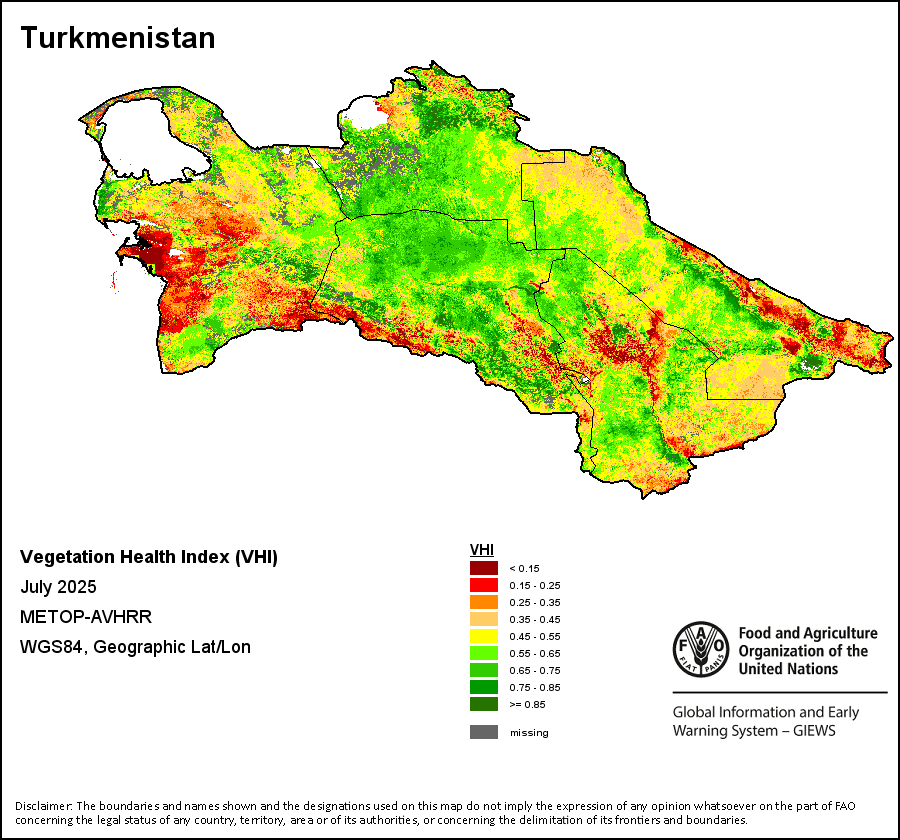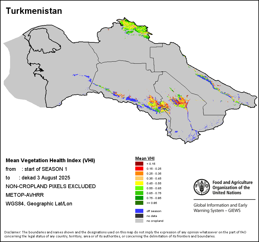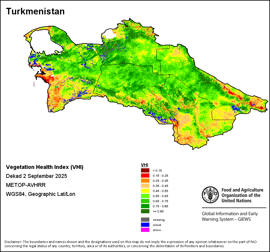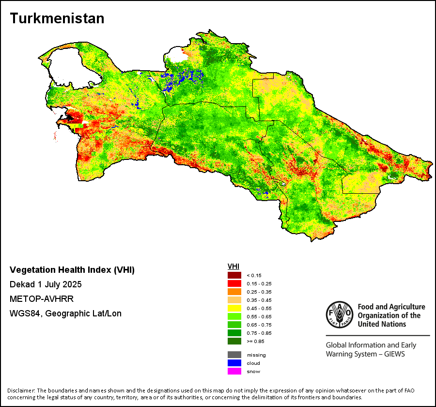 植被健康指数(VHI)根据植被健康状况以及气温对作物状况的影响情况显示干旱的严重程度。 VHI是一项综合指数,是用于计算ASI的基础性指标。它结合了植被状况指数(VCI)和气温状况指数(TCI)。TCI的计算采用了与VCI类似的方程,但它把当前气温与长期最高和最低值联系起来,因为一个假定前提是气温越高就倾向于造成植被状况恶化。比方说,VHI指数下降就意味着植被状况相对较差,而气温越高则意味着植被状况受到胁迫,较长时间延续则成为干旱的指征。VHI映像针对两个主要季节进行计算并分为三种时间模式:旬度、月度和年度。