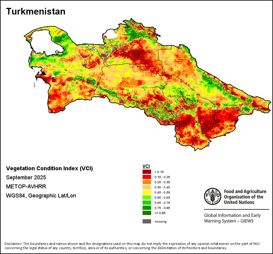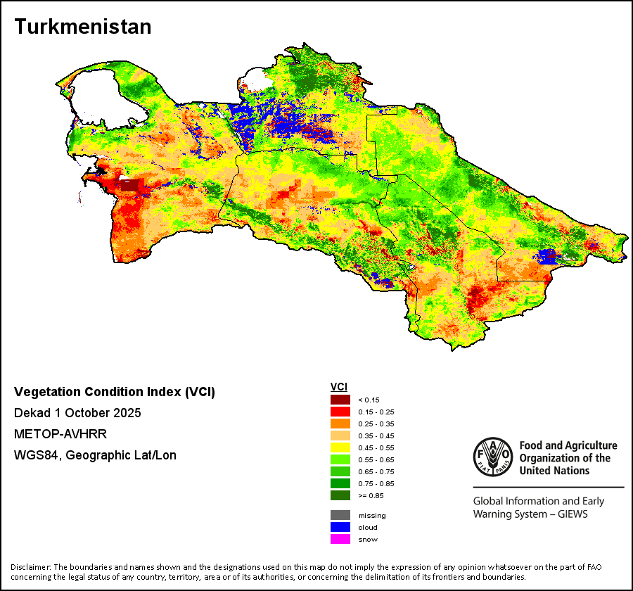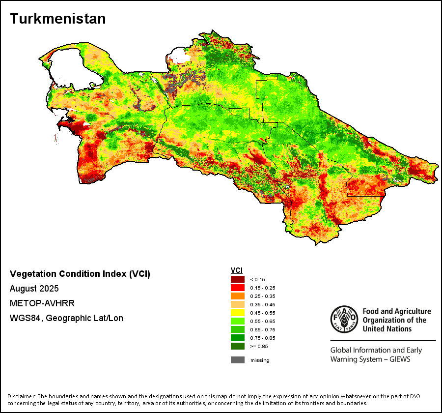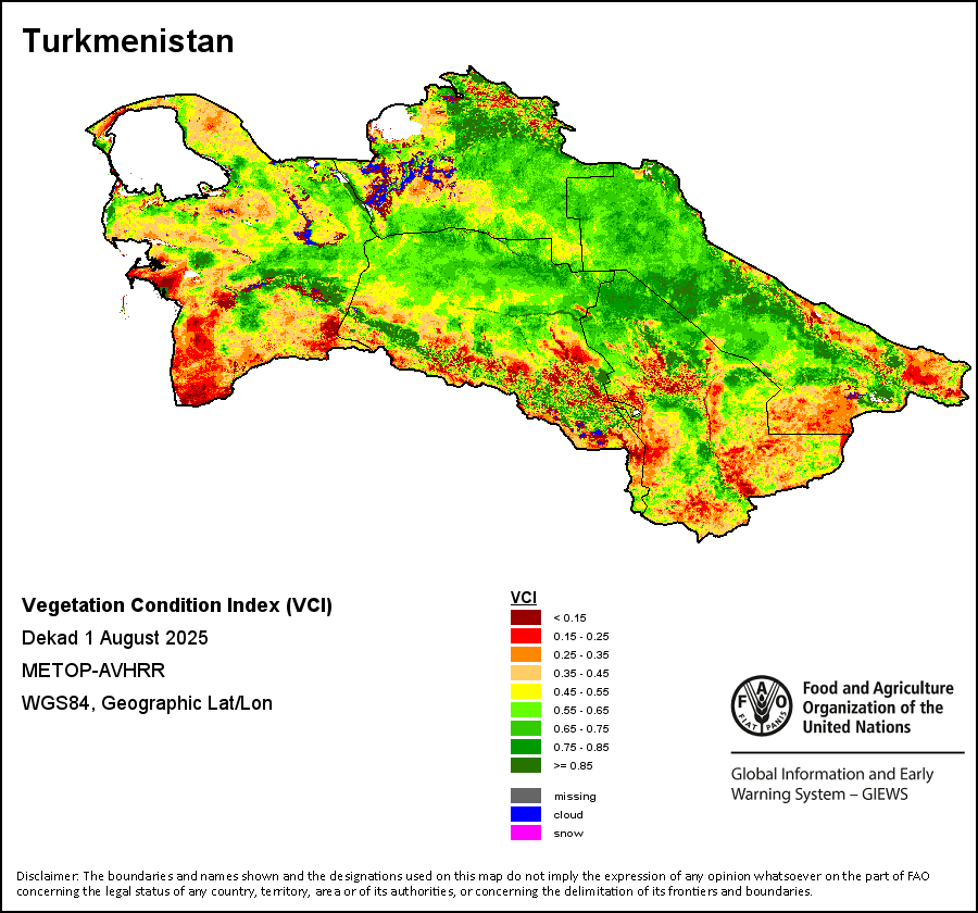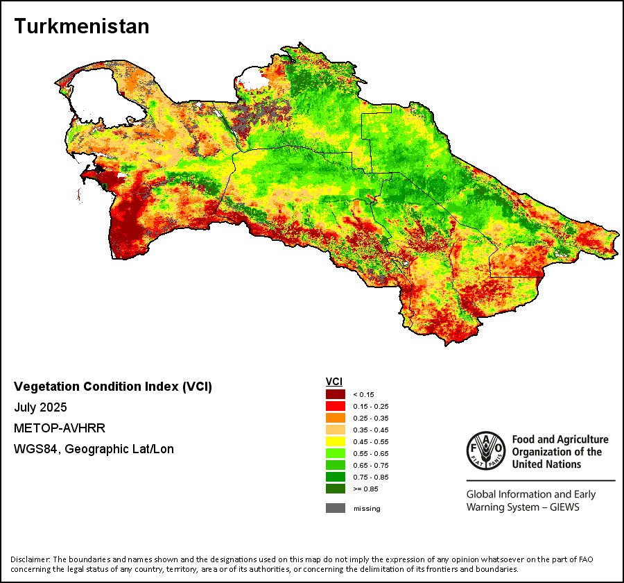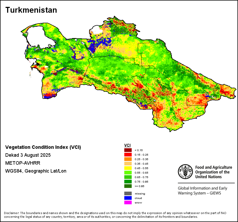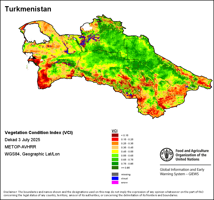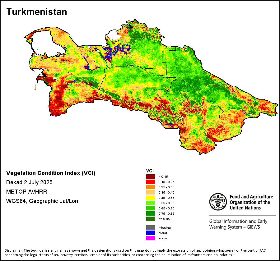 植被状况指数(VCI)评价的是与历史趋势相比当前的植被健康状况。 VCI指数考查的是当前一旬归一化差异植被指数(NDVI)与其长期最小值和最大值之间的关系,使用同一旬的历史NDVI值范围进行归一化计算。VCI的目的是把NDVI中与天气相关的成分从生态要素中分离出来。