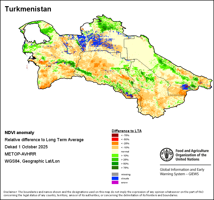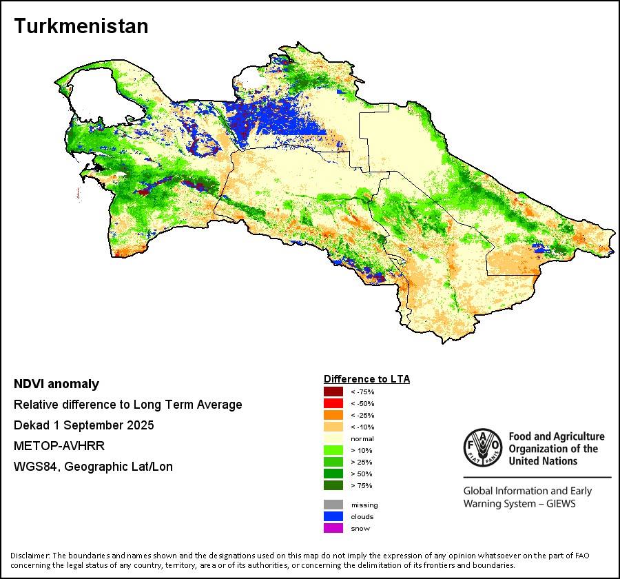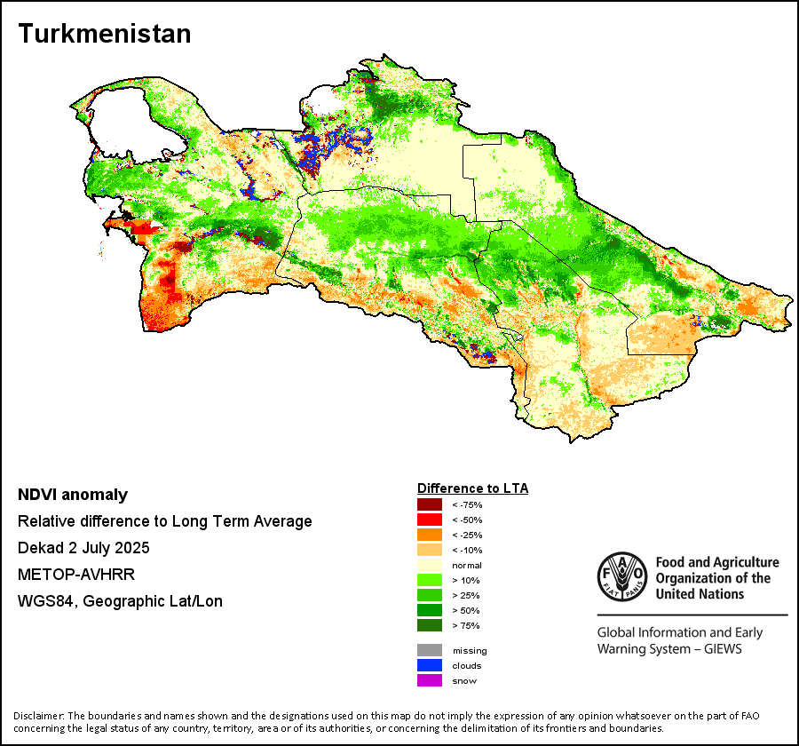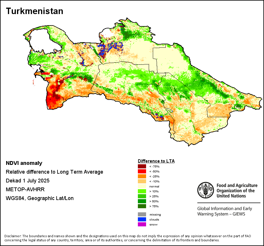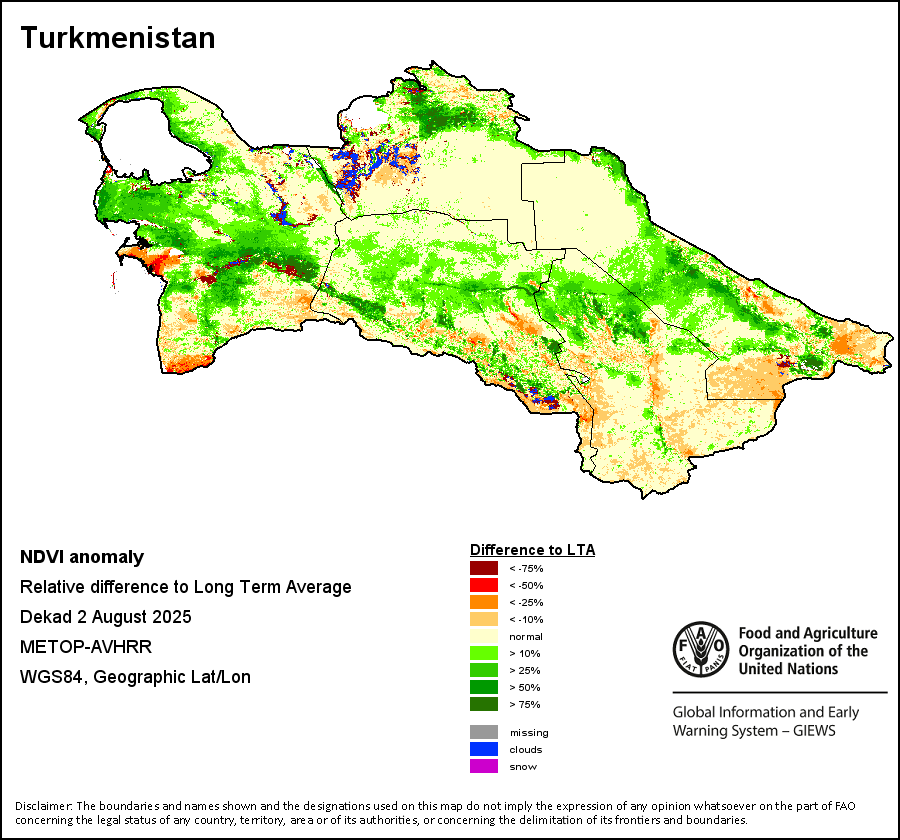 归一化差异植被指数(NDVI)衡量的是地表覆被的绿色程度,以此代表植被的密度和健康度情况。NDVI值的区间从+1至-1,正值越高代表植被的密度和健康度越高,NDVI低值和/或负值则显示植被状况不佳或稀疏。NDVI异常值显示的是当前10天与长期平均值之间的变量,正值(例如20%)就代表植被状况好于平均水平,而负值(如-40%)则代表植被状况相对较差。