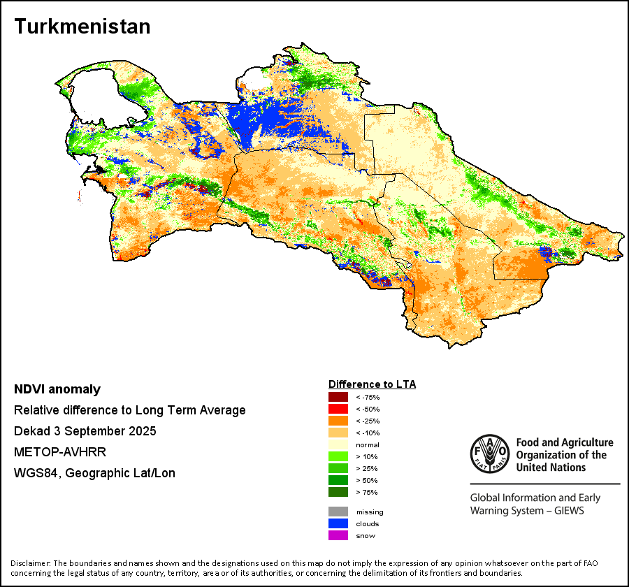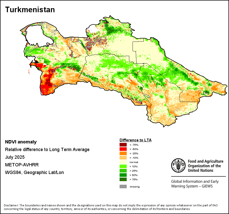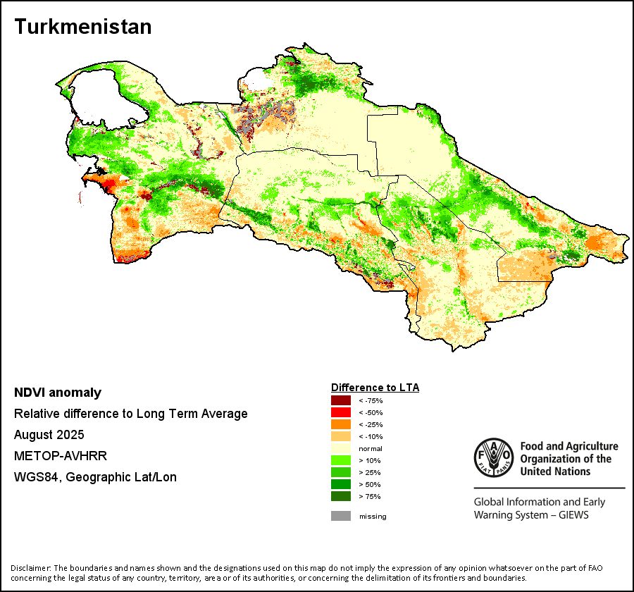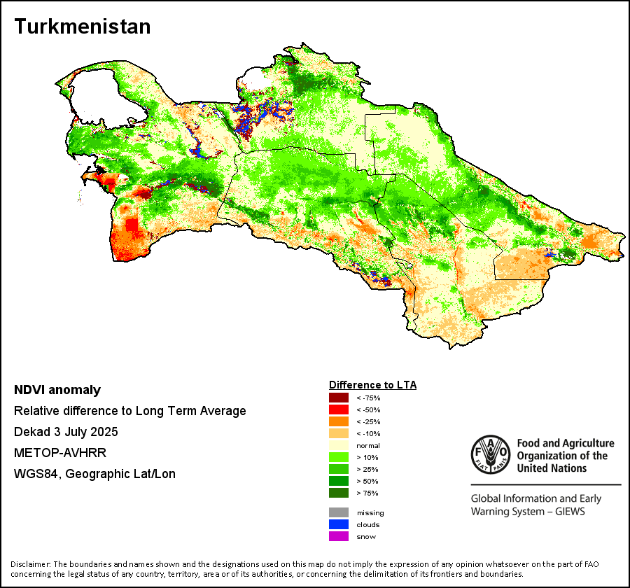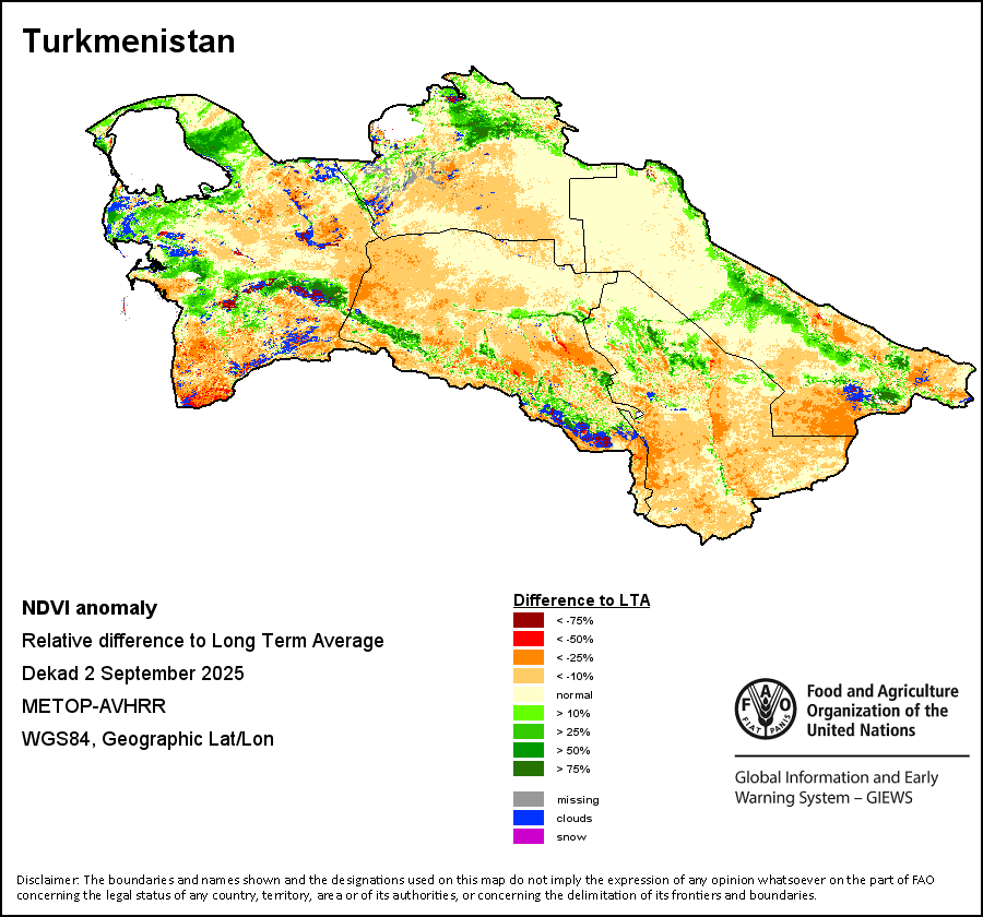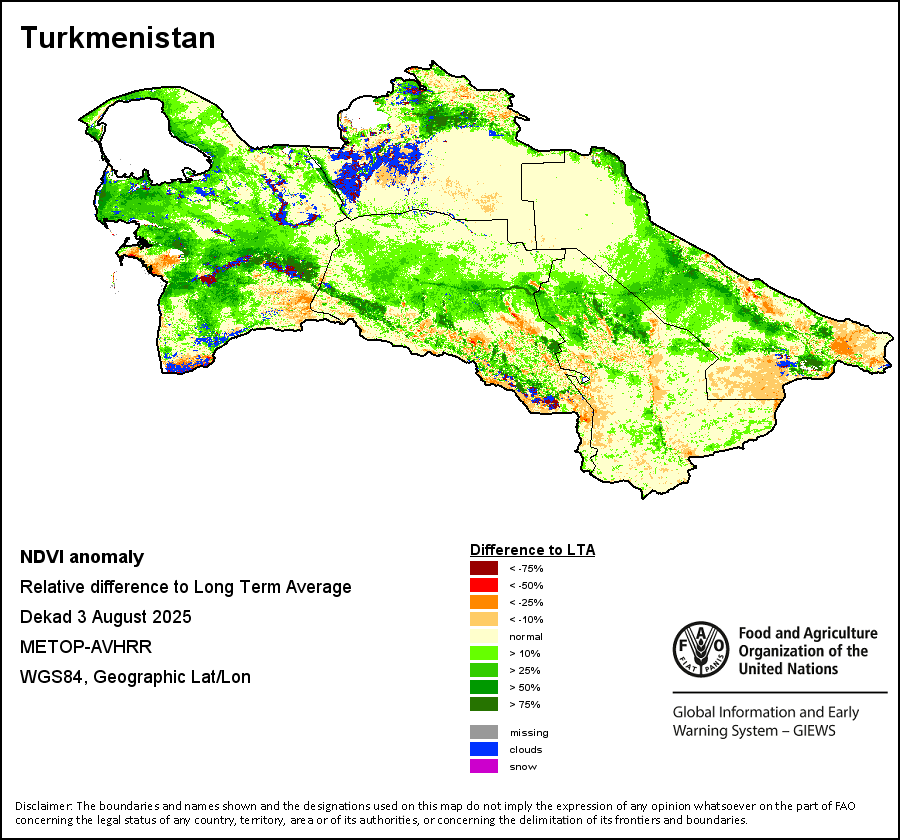 归一化差异植被指数(NDVI)衡量的是地表覆被的绿色程度,以此代表植被的密度和健康度情况。NDVI值的区间从+1至-1,正值越高代表植被的密度和健康度越高,NDVI低值和/或负值则显示植被状况不佳或稀疏。NDVI异常值显示的是当前10天与长期平均值之间的变量,正值(例如20%)就代表植被状况好于平均水平,而负值(如-40%)则代表植被状况相对较差。