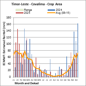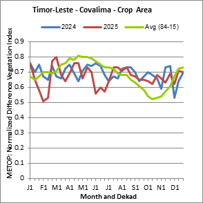 The Normalized Difference Vegetation Index (NDVI) measures the “greenness” of ground cover and is used as a proxy to indicate the density and health of vegetation. NDVI values range from +1 to -1, with high positive values corresponding to dense and healthy vegetation, and low and/or negative NDVI values indicating poor vegetation conditions or sparse vegetative cover. The NDVI anomaly indicates the variation of the current dekad to the long-term average, where a positive value (for example 20 percent) would signify enhanced vegetation conditions compared to the average, while a negative value (for instance -40 percent) would indicate comparatively poor vegetation conditions.