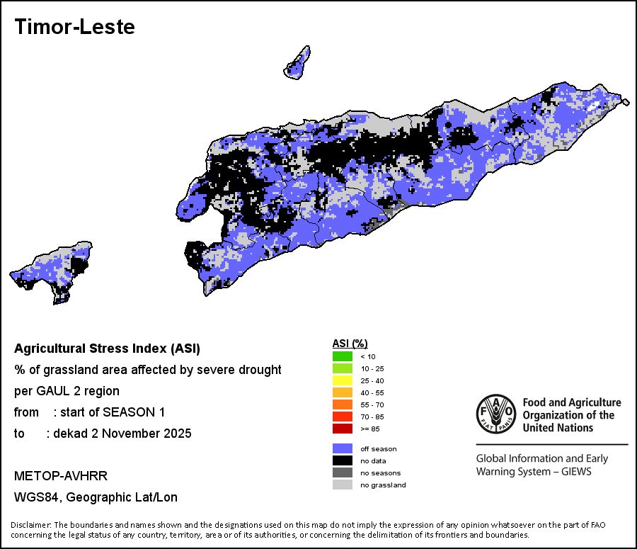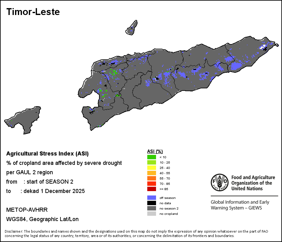 The Agricultural Stress Index (ASI) is a quick-look indicator that facilitates the early identification of cropped land with a high likelihood of water stress (drought). The Index is based on the integration of the Vegetation Health Index (VHI) in two dimensions that are critical in the assessment of a drought event in agriculture: temporal and spatial. The first step of the ASI calculation is a temporal averaging of the VHI, assessing the intensity and duration of dry periods occurring during the crop cycle at the pixel level; this calculation includes the use of crop coefficients, which introduces sensitivity of a crop to water stress during each phenological phase. The second step determines the spatial extent of drought events by calculating the percentage of pixels in arable areas with a VHI value below 35 percent (this value was identified as a critical threshold in assessing the extent of drought in previous research by Kogan, 1995). Each administrative area is classified according to the percentage of the affected area to facilitate the quick interpretation of results.