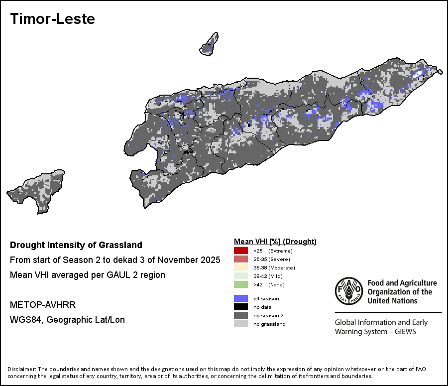 Agricultural droughts are classified by their intensity and are categorized into four classes: Extreme, Severe, Moderate or Mild. The intensity of the drought is calculated through the Weighted Mean Vegetation Health Index aggregated per GAUL 2 region, indicating that the poorer the vegetation health the more severe the drought.