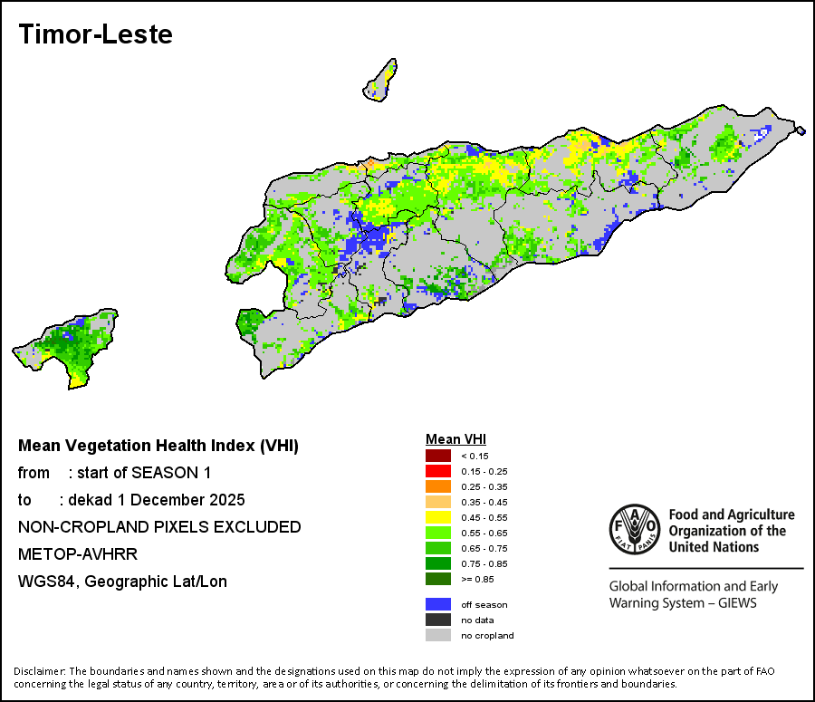 The country level maps and graphs depict the latest 36-month period of the seasonal, vegetation and precipitation indicators. The data is presented by dekad and month. All three vegetation indicators are based on 10-day (dekadal) vegetation data from the METOP-AVHRR sensor at 1 km resolution (2007 and after). Data at 1 km resolution for the period 1984-2006 are derived from the NOAA-AVHRR dataset at 16 km resolution. Precipitation estimates for all African countries (except Cabo Verde and Mauritius) are taken from NOAA/FEWSNet (16 km resolution), while for the remaining countries data is obtained from ECMWF (25 km resolution). Owing to the higher resolution of vegetation indicators (e.g., NDVI, VHI) compared to coarser precipitation indicators, the number of sub-national units for which valid zonal statistics can be generated for vegetation indices is greater than the number of units for precipitation indicators for certain countries.