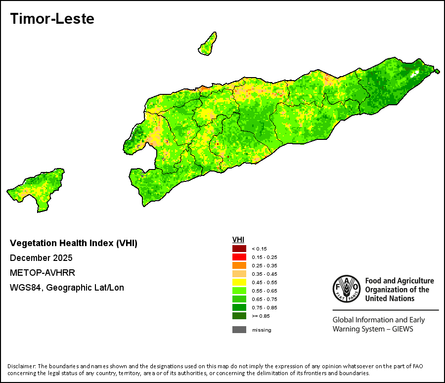 The Vegetation Health Index (VHI) illustrates the severity of drought based on the vegetation health and the influence of temperature on plant conditions. The VHI is a composite index and the elementary indicator used to compute the ASI. It combines both the Vegetation Condition Index (VCI) and the Temperature Condition Index (TCI). The TCI is calculated using a similar equation to the VCI, but relates the current temperature to the long-term maximum and minimum , as it is assumed that higher temperatures tend to cause a deterioration in vegetation conditions. A decrease in the VHI would, for example, indicate relatively poor vegetation conditions and warmer temperatures, signifying stressed vegetation conditions, and over a longer period would be indicative of drought. The VHI images are computed for the two main seasons and in three modalities: dekadal, monthly and annual.