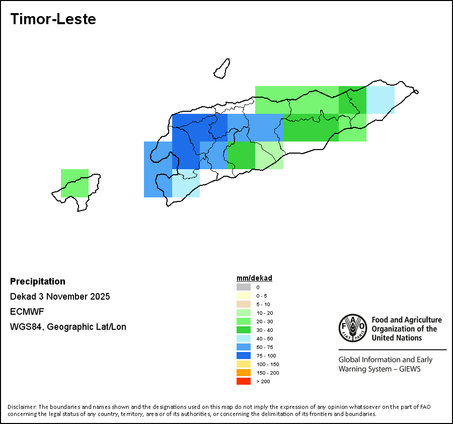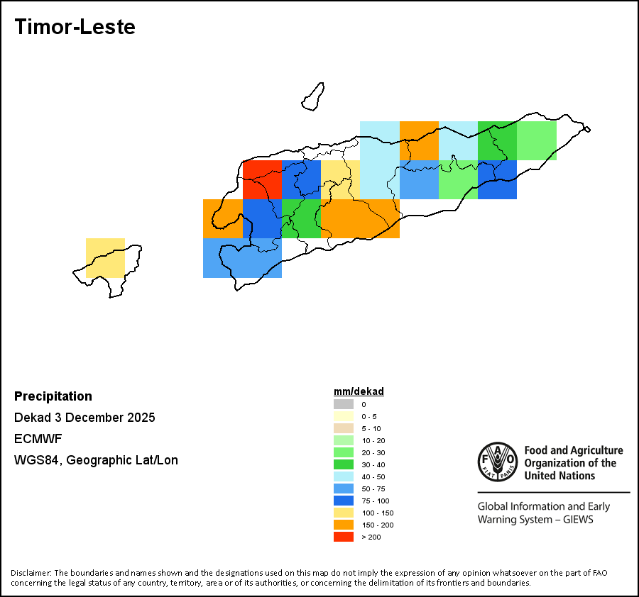 The map depicts cumulative rainfall volumes over a dekad (a 10-day period). Precipitation estimates for all African countries (except Cabo Verde and Mauritius) are taken from NOAA/FEWSNet, while for the remaining countries data is obtained from ECMWF.