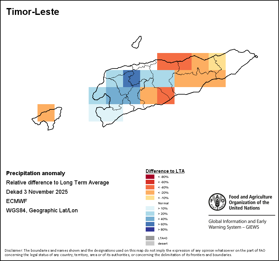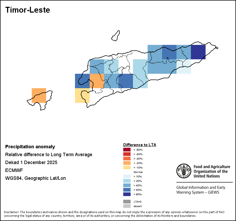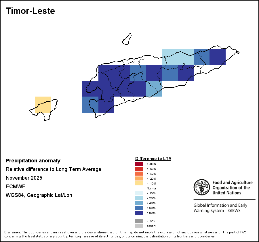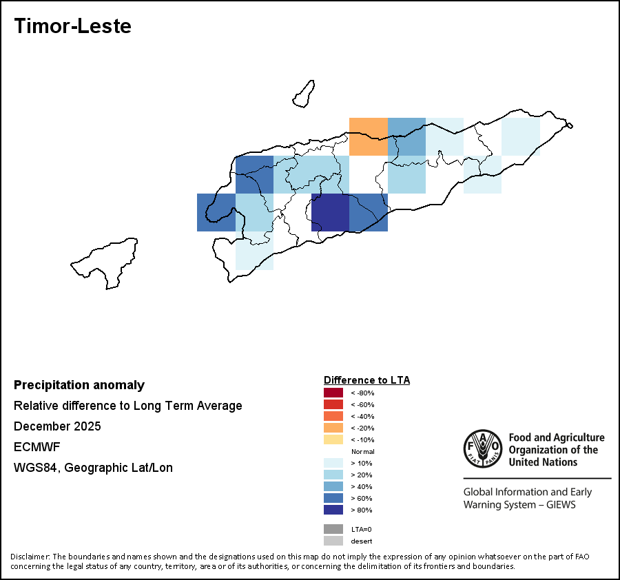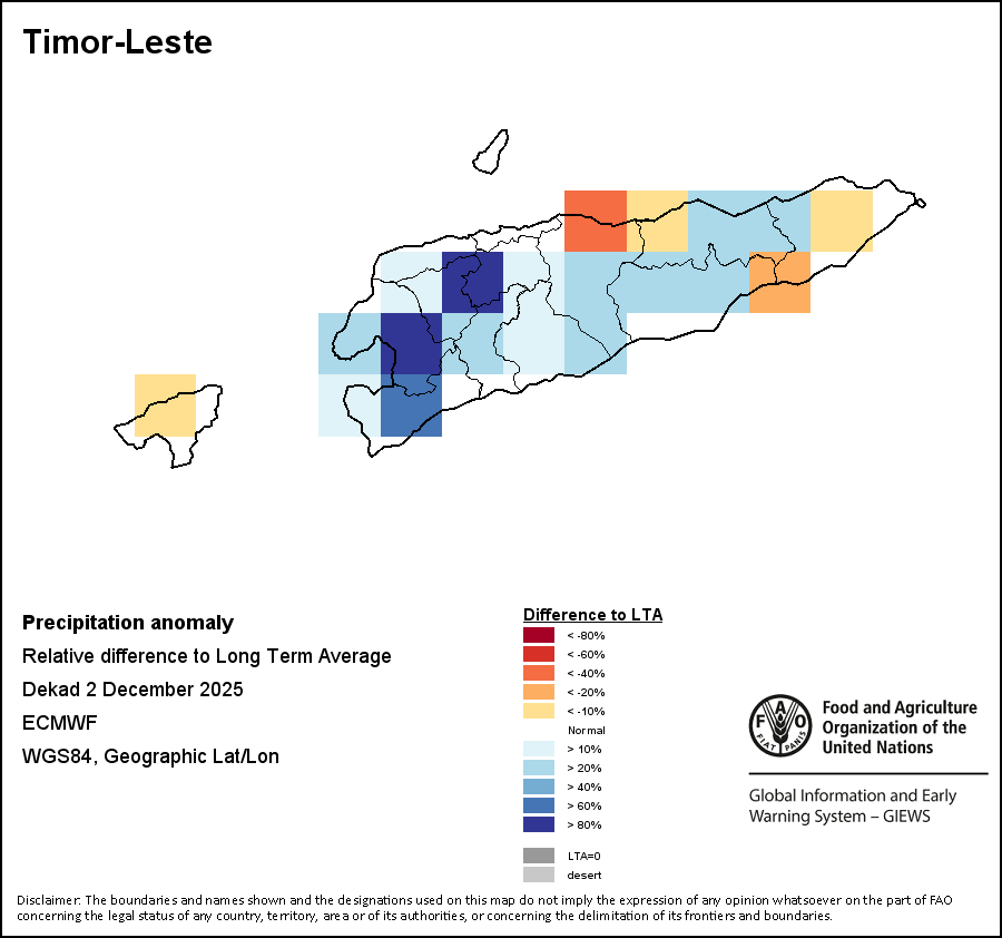 The map illustrates the difference between the current rainfall volume and the average level. Rainfall levels are compared with the Long-Term Average (LTA), which refers to the period 1989-2015. Warmer colours identify areas which have received lower-than-average rainfall, while colder colours are given to areas where precipitation has been above average.