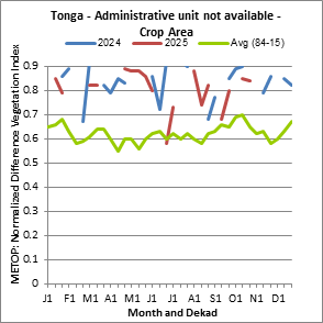 The Normalized Difference Vegetation Index (NDVI) measures the “greenness” of ground cover and is used as a proxy to indicate the density and health of vegetation. NDVI values range from +1 to -1, with high positive values corresponding to dense and healthy vegetation, and low and/or negative NDVI values indicating poor vegetation conditions or sparse vegetative cover. The NDVI anomaly indicates the variation of the current dekad to the long-term average, where a positive value (for example 20 percent) would signify enhanced vegetation conditions compared to the average, while a negative value (for instance -40 percent) would indicate comparatively poor vegetation conditions.