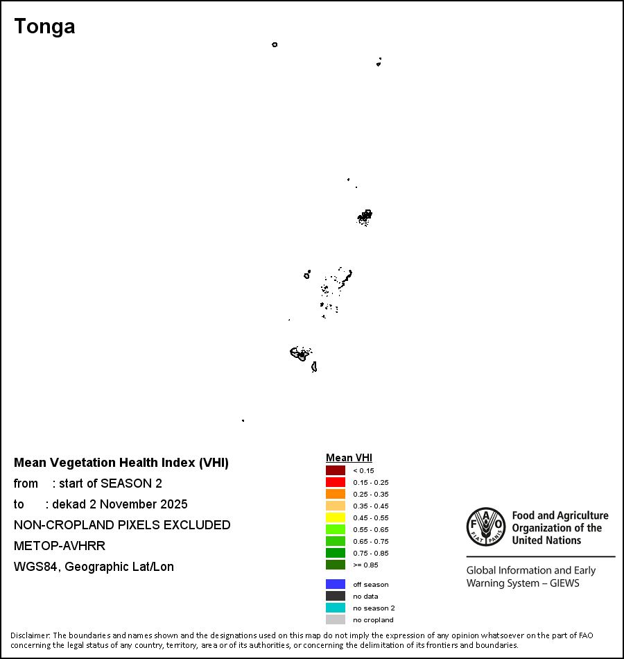 The country level maps and graphs depict the latest 36-month period of the seasonal, vegetation and precipitation indicators. The data is presented by dekad and month. All three vegetation indicators are based on 10-day (dekadal) vegetation data from the METOP-AVHRR sensor at 1 km resolution (2007 and after). Data at 1 km resolution for the period 1984-2006 are derived from the NOAA-AVHRR dataset at 16 km resolution. Precipitation estimates for all African countries (except Cabo Verde and Mauritius) are taken from NOAA/FEWSNet (16 km resolution), while for the remaining countries data is obtained from ECMWF (25 km resolution). Owing to the higher resolution of vegetation indicators (e.g., NDVI, VHI) compared to coarser precipitation indicators, the number of sub-national units for which valid zonal statistics can be generated for vegetation indices is greater than the number of units for precipitation indicators for certain countries.