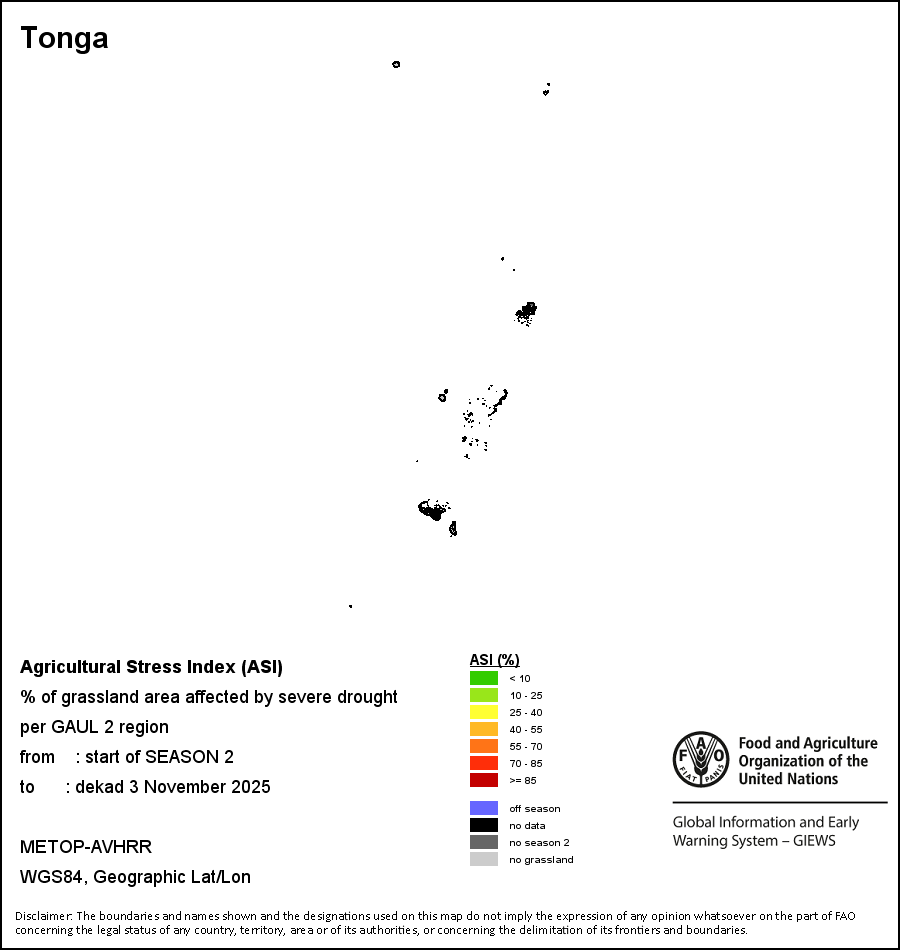 The Agricultural Stress Index (ASI) is a quick-look indicator that facilitates the early identification of cropped land with a high likelihood of water stress (drought). The Index is based on the integration of the Vegetation Health Index (VHI) in two dimensions that are critical in the assessment of a drought event in agriculture: temporal and spatial. The first step of the ASI calculation is a temporal averaging of the VHI, assessing the intensity and duration of dry periods occurring during the crop cycle at the pixel level; this calculation includes the use of crop coefficients, which introduces sensitivity of a crop to water stress during each phenological phase. The second step determines the spatial extent of drought events by calculating the percentage of pixels in arable areas with a VHI value below 35 percent (this value was identified as a critical threshold in assessing the extent of drought in previous research by Kogan, 1995). Each administrative area is classified according to the percentage of the affected area to facilitate the quick interpretation of results.