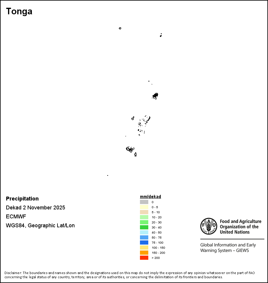 The map depicts cumulative rainfall volumes over a dekad (a 10-day period). Precipitation estimates for all African countries (except Cabo Verde and Mauritius) are taken from NOAA/FEWSNet, while for the remaining countries data is obtained from ECMWF.
