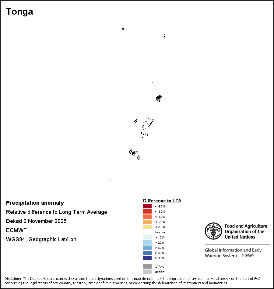 The map illustrates the difference between the current rainfall volume and the average level. Rainfall levels are compared with the Long-Term Average (LTA), which refers to the period 1989-2015. Warmer colours identify areas which have received lower-than-average rainfall, while colder colours are given to areas where precipitation has been above average.