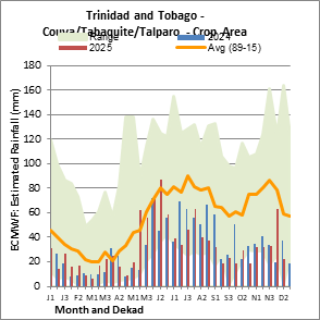 Les cartes et les graphiques au niveau des pays illustrent les indicateurs d’avancement de la campagne, de végétation et de pluviométrie au cours des 36 derniers mois. Les données sont présentées par décade et par mois. Les trois indicateurs de végétation sont basés sur les données relatives à la végétation pour 10 jours (décade) du capteur Metop-AVHRR par pixel de 1 km (à partir de 2007). Les données à 1 km de résolution pour la période 1984-2006 ont été dérivées des données du NOAA-AVHRR à 16 km de résolution. - Les estimations concernant les précipitations pour tous les pays africains (à l'exception du Cap Vert et de Maurice) proviennent du NOAA/FEWSNet, tandis que les données concernant les autres pays sont obtenues à partir du CEPMMT. Compte tenu de la résolution plus élevée des indicateurs de végétation (ex. NDVI, VHI) par rapport à celle des indicateurs de précipitations, plus grossiers, le nombre d’unités infranationales pour lesquelles des statistiques zonales valides peuvent être produites à partir des indices de végétation est, dans certains pays, supérieur à celui obtenu à partir des indicateurs de précipitations.