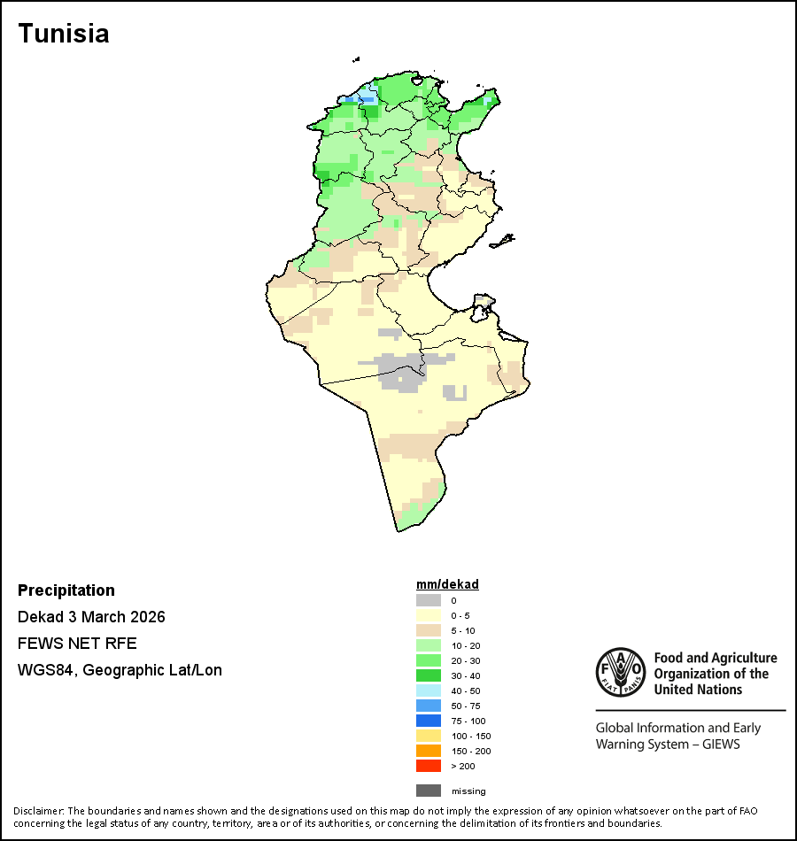 На карте изображены кумулятивные объемы осадков в декаду (10-дневный период). Оценки атмосферных осадков для всех африканских стран (за исключением Кабо-Верде и Маврикия) получены из системы NOAA/Системы раннего предупреждения об опасности голода, а по остальным странам данные получены из системы ECMWF.