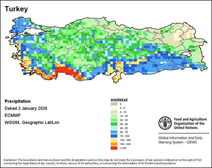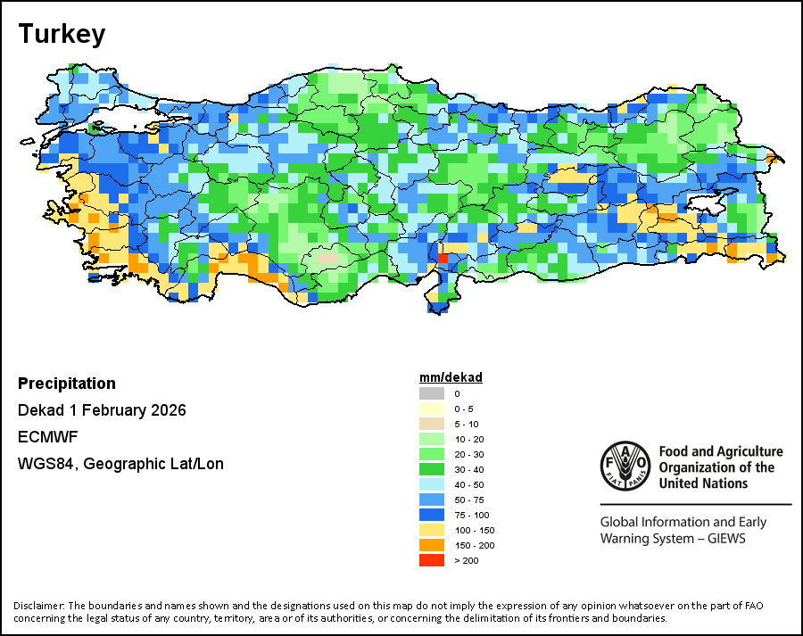 La carte illustre les volumes cumulés de précipitations au cours d’une décade (une période de 10 jours). Les estimations concernant les précipitations pour tous les pays africains (à l'exception du Cap Vert et de Maurice) proviennent du NOAA/FEWSNet, tandis que les données concernant les autres pays sont obtenues à partir du CEPMMT.