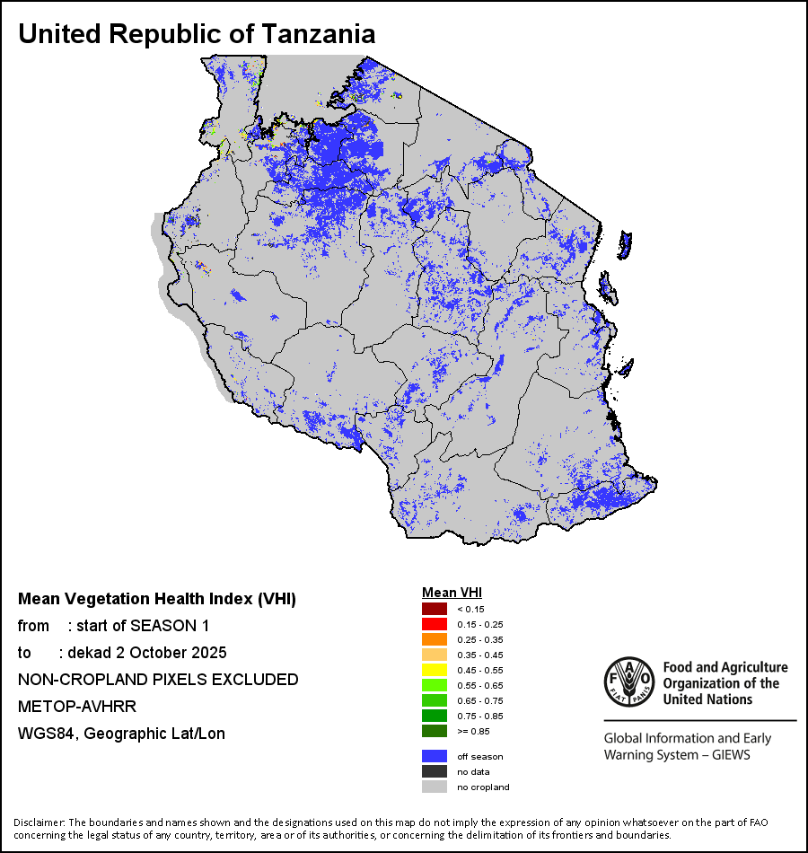 The Vegetation Health Index (VHI) illustrates the severity of drought based on the vegetation health and the influence of temperature on plant conditions. The VHI is a composite index and the elementary indicator used to compute the ASI. It combines both the Vegetation Condition Index (VCI) and the Temperature Condition Index (TCI). The TCI is calculated using a similar equation to the VCI, but relates the current temperature to the long-term maximum and minimum , as it is assumed that higher temperatures tend to cause a deterioration in vegetation conditions. A decrease in the VHI would, for example, indicate relatively poor vegetation conditions and warmer temperatures, signifying stressed vegetation conditions, and over a longer period would be indicative of drought. The VHI images are computed for the two main seasons and in three modalities: dekadal, monthly and annual.