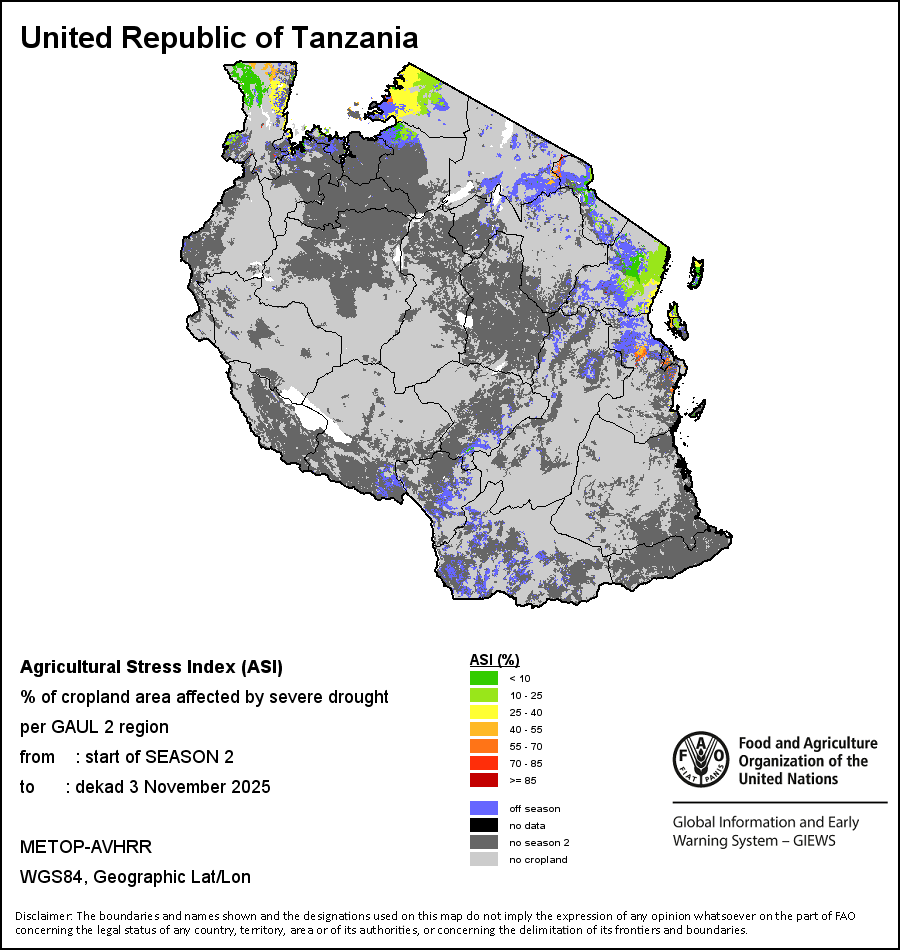 The Agricultural Stress Index (ASI) is a quick-look indicator that facilitates the early identification of cropped land with a high likelihood of water stress (drought). The Index is based on the integration of the Vegetation Health Index (VHI) in two dimensions that are critical in the assessment of a drought event in agriculture: temporal and spatial. The first step of the ASI calculation is a temporal averaging of the VHI, assessing the intensity and duration of dry periods occurring during the crop cycle at the pixel level; this calculation includes the use of crop coefficients, which introduces sensitivity of a crop to water stress during each phenological phase. The second step determines the spatial extent of drought events by calculating the percentage of pixels in arable areas with a VHI value below 35 percent (this value was identified as a critical threshold in assessing the extent of drought in previous research by Kogan, 1995). Each administrative area is classified according to the percentage of the affected area to facilitate the quick interpretation of results.