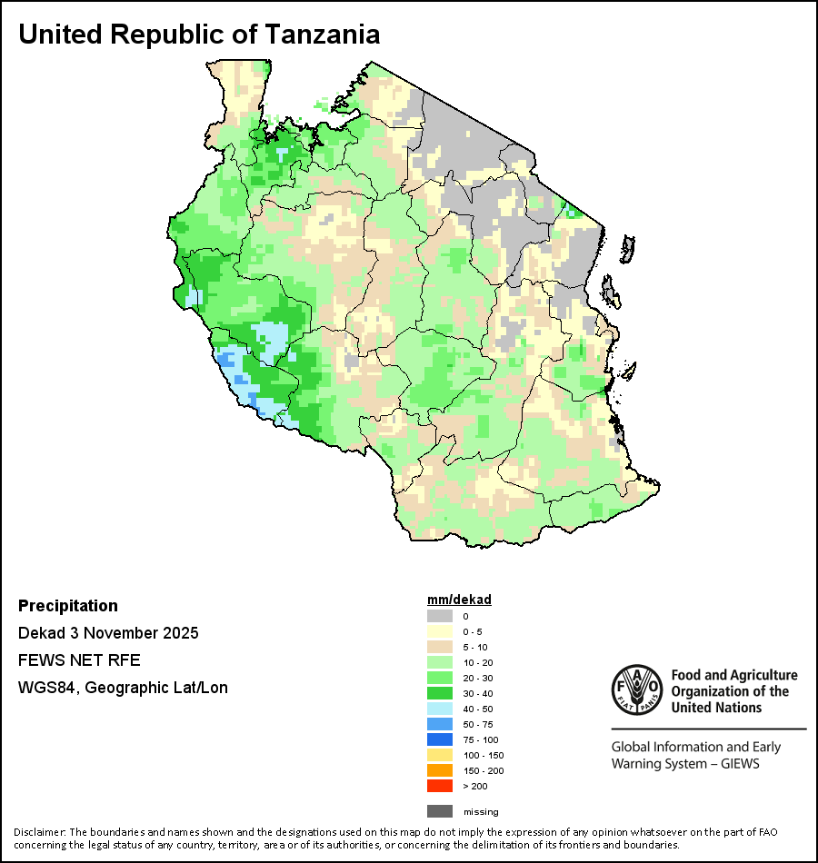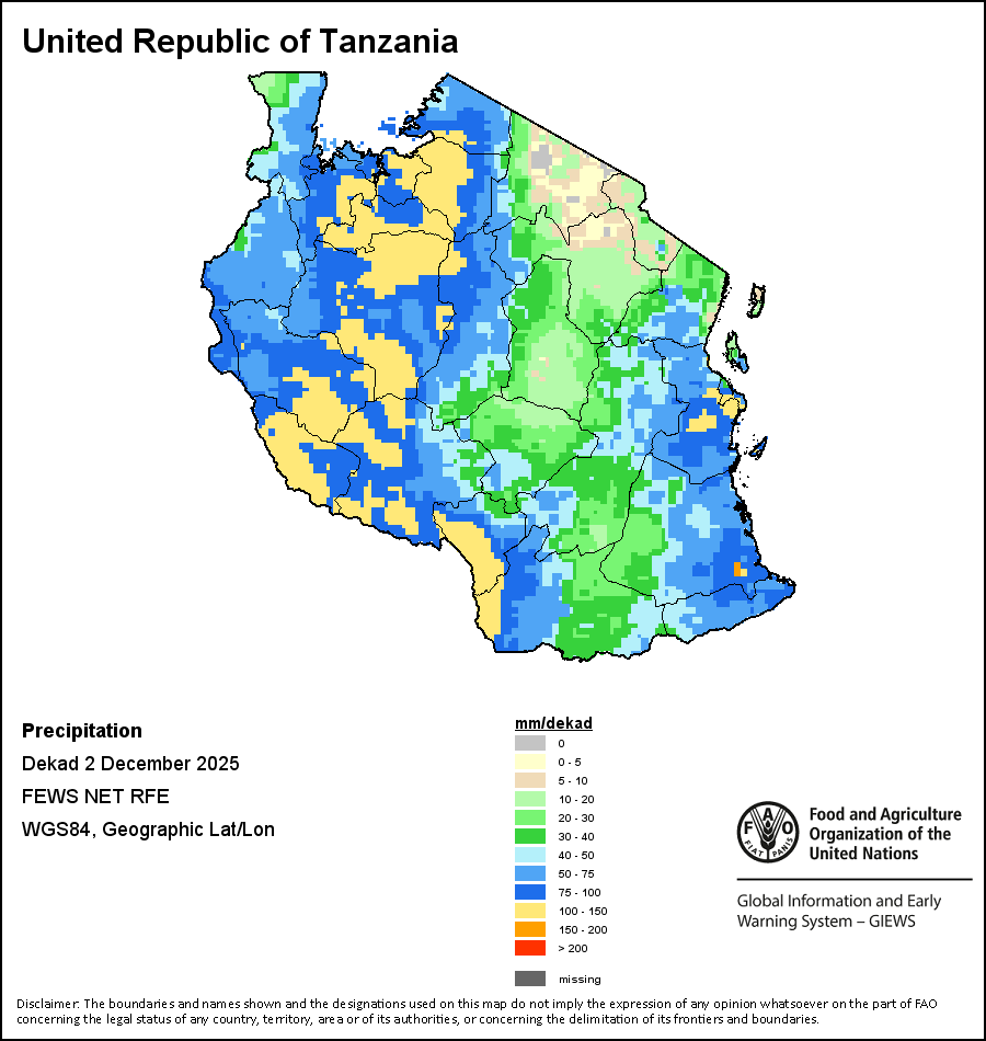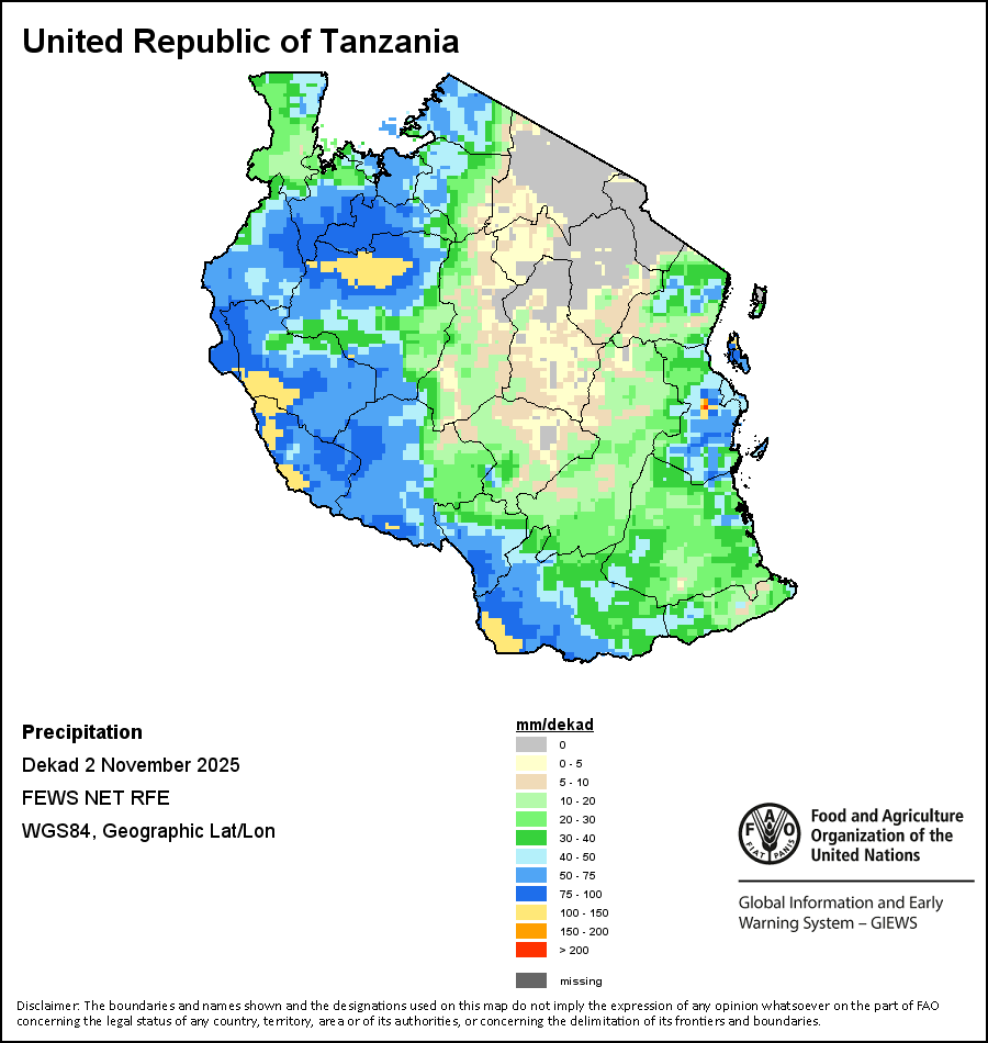 The map depicts cumulative rainfall volumes over a dekad (a 10-day period). Precipitation estimates for all African countries (except Cabo Verde and Mauritius) are taken from NOAA/FEWSNet, while for the remaining countries data is obtained from ECMWF.