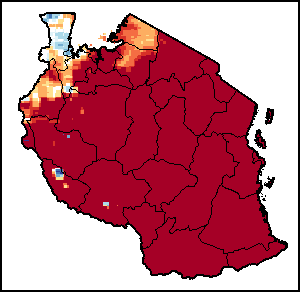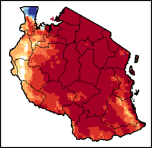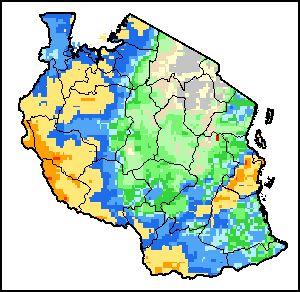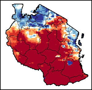 The Normalized Difference Vegetation Index (NDVI) measures the “greenness” of ground cover and is used as a proxy to indicate the density and health of vegetation. NDVI values range from +1 to -1, with high positive values corresponding to dense and healthy vegetation, and low and/or negative NDVI values indicating poor vegetation conditions or sparse vegetative cover. The NDVI anomaly indicates the variation of the current dekad to the long-term average, where a positive value (for example 20 percent) would signify enhanced vegetation conditions compared to the average, while a negative value (for instance -40 percent) would indicate comparatively poor vegetation conditions.