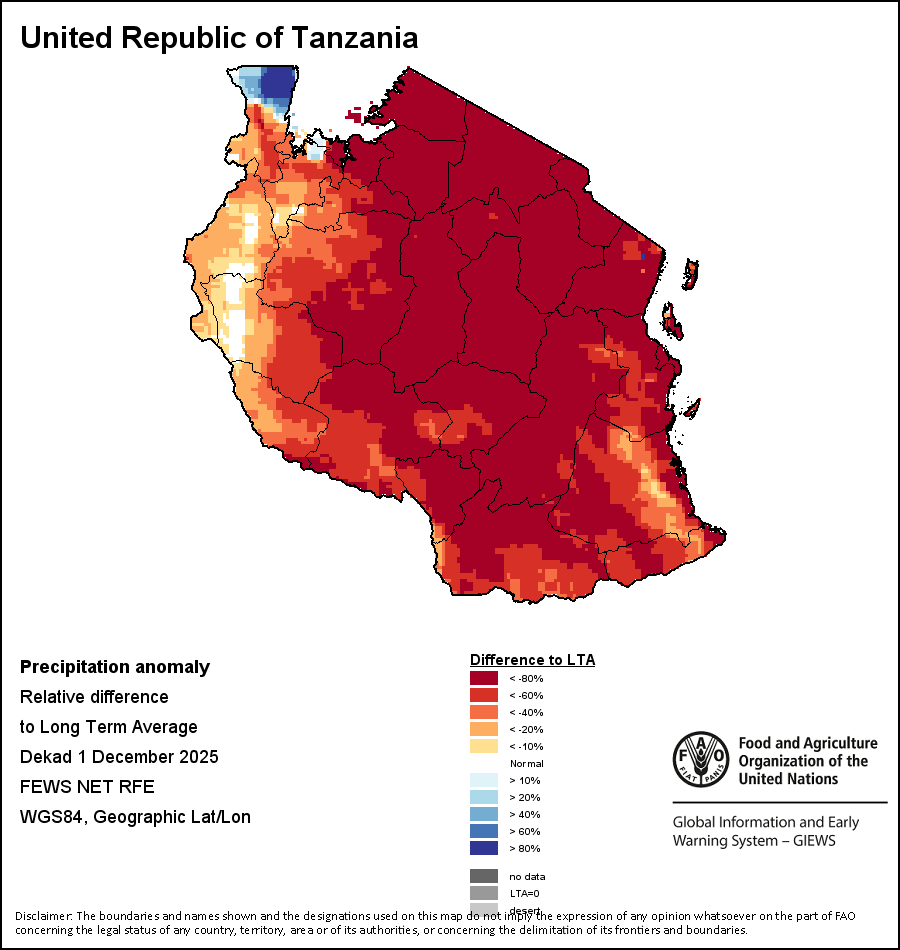 The map illustrates the difference between the current rainfall volume and the average level. Rainfall levels are compared with the Long-Term Average (LTA), which refers to the period 1989-2015. Warmer colours identify areas which have received lower-than-average rainfall, while colder colours are given to areas where precipitation has been above average.