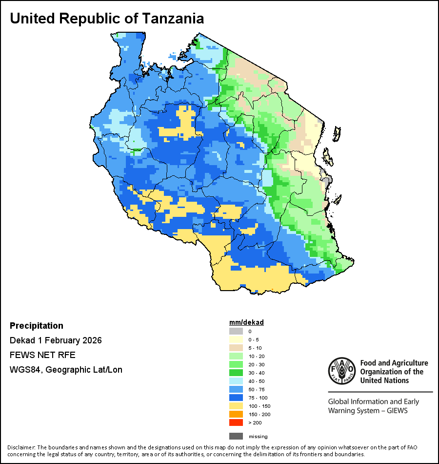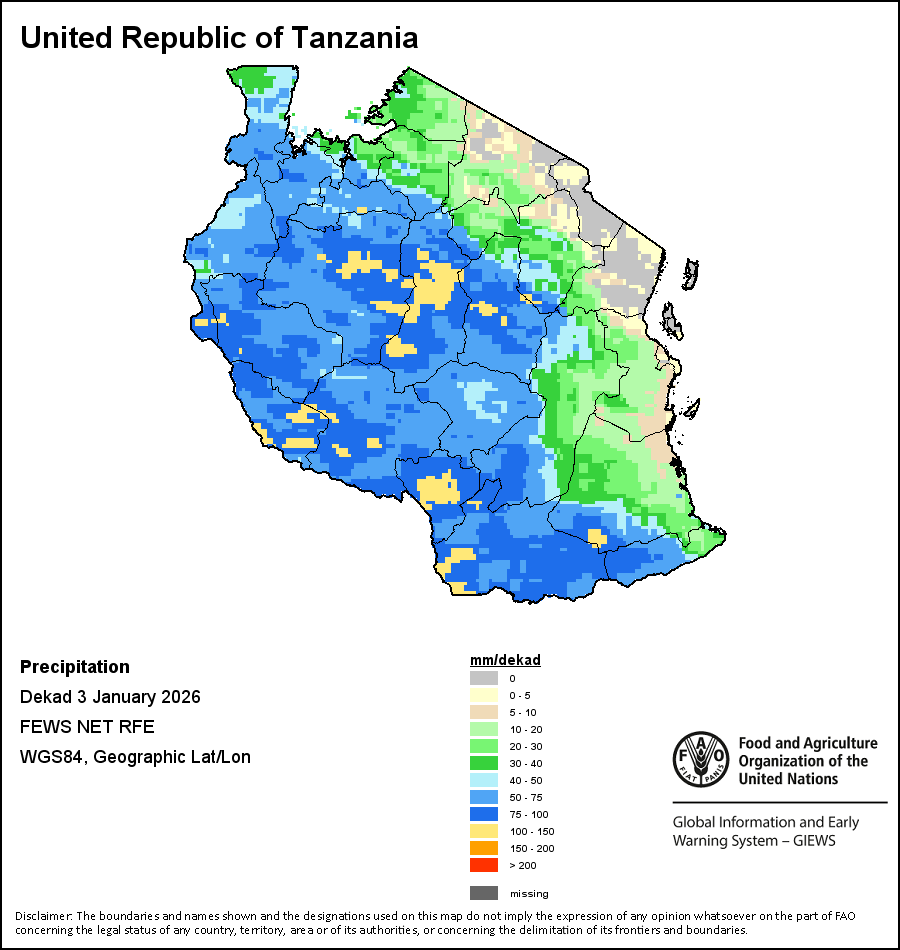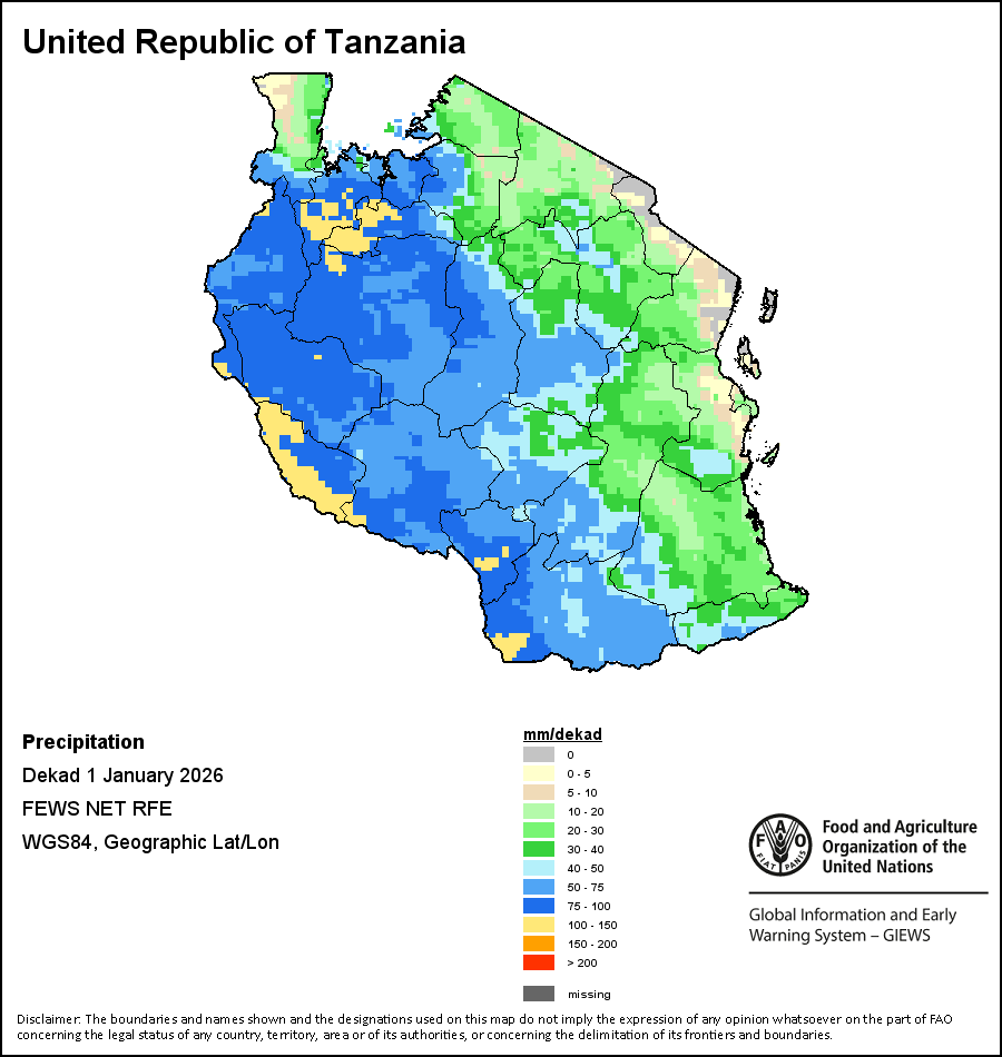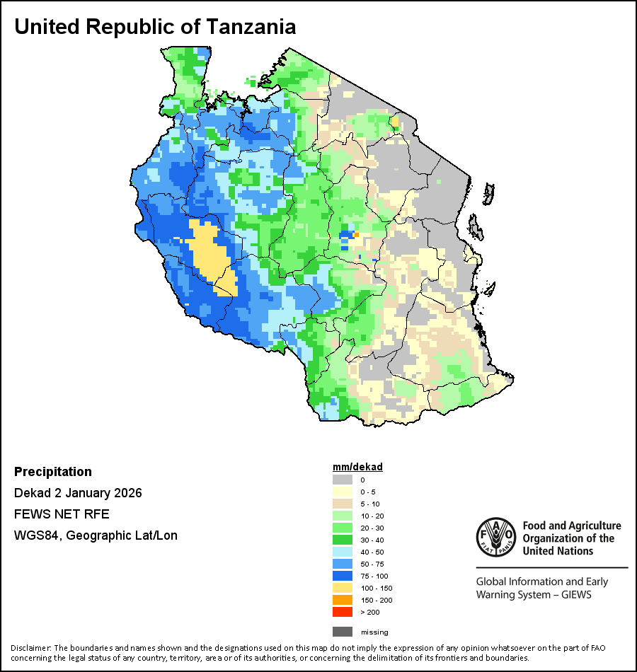 La carte illustre les volumes cumulés de précipitations au cours d’une décade (une période de 10 jours). Les estimations concernant les précipitations pour tous les pays africains (à l'exception du Cap Vert et de Maurice) proviennent du NOAA/FEWSNet, tandis que les données concernant les autres pays sont obtenues à partir du CEPMMT.