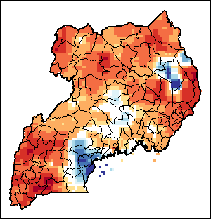 该图谱显示了当前降水量与平均水平之间的差异。 由降水量水平与长期平均值(LTA)进行比较得出,长期平均值系指1989-2015年期间的数值。暖色调指示的是降水量低于平均水平的地区,而冷色调指示的则是降水量高于平均水平的地区。降雨量估算数据来自欧洲中期天气预报这些(ECMWF)。