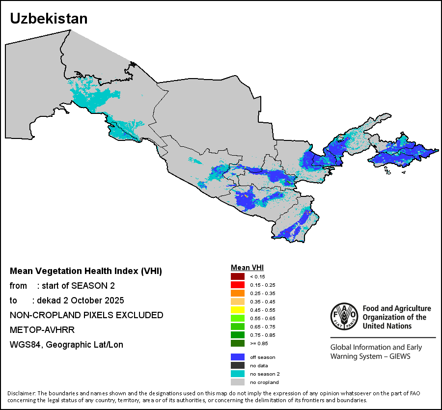 The Weighted Mean Vegetation Health Index (Weighted Mean VHI) allows the user to assess the severity of the drought from the start of the growing season, examining the vegetation health and the influence of temperature on plant conditions. The Mean VHI is an average of the dekadal VHI values over the crop growing season (from the start until the last dekad of analysis), weighted by crop coefficients (Kc), assigned to VHI values at the dekads corresponding to the Start of the Season (SOS), Maximum of the Season (MOS) and End of the Season (EOS). Crop coefficient is applied for the purpose of reflecting the crop’s water sensitivity at different phenology stages.