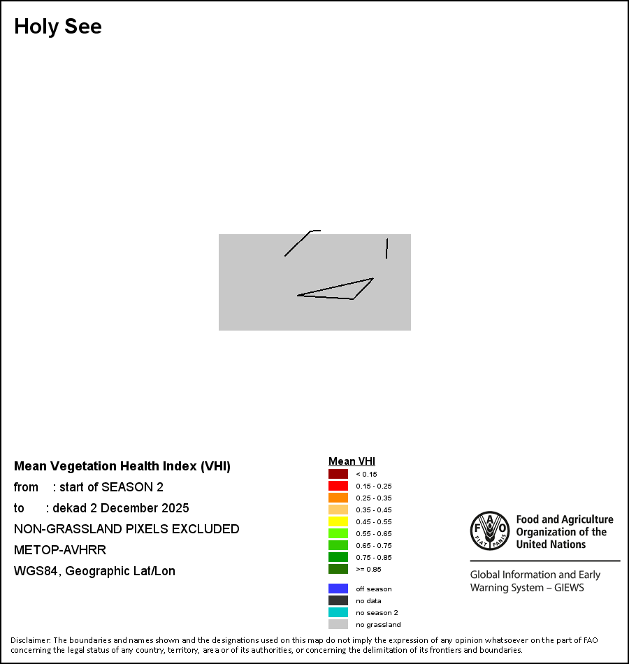 The country level maps and graphs depict the latest 36-month period of the seasonal, vegetation and precipitation indicators. The data is presented by dekad and month. All three vegetation indicators are based on 10-day (dekadal) vegetation data from the METOP-AVHRR sensor at 1 km resolution (2007 and after). Data at 1 km resolution for the period 1984-2006 are derived from the NOAA-AVHRR dataset at 16 km resolution. Precipitation estimates for all African countries (except Cabo Verde and Mauritius) are taken from NOAA/FEWSNet (16 km resolution), while for the remaining countries data is obtained from ECMWF (25 km resolution). Owing to the higher resolution of vegetation indicators (e.g., NDVI, VHI) compared to coarser precipitation indicators, the number of sub-national units for which valid zonal statistics can be generated for vegetation indices is greater than the number of units for precipitation indicators for certain countries.