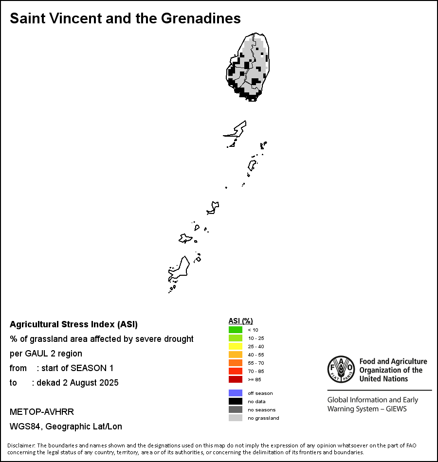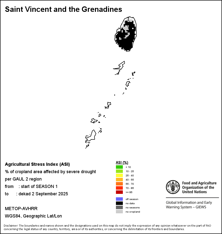 The Agricultural Stress Index (ASI) is a quick-look indicator that facilitates the early identification of cropped land with a high likelihood of water stress (drought). The Index is based on the integration of the Vegetation Health Index (VHI) in two dimensions that are critical in the assessment of a drought event in agriculture: temporal and spatial. The first step of the ASI calculation is a temporal averaging of the VHI, assessing the intensity and duration of dry periods occurring during the crop cycle at the pixel level; this calculation includes the use of crop coefficients, which introduces sensitivity of a crop to water stress during each phenological phase. The second step determines the spatial extent of drought events by calculating the percentage of pixels in arable areas with a VHI value below 35 percent (this value was identified as a critical threshold in assessing the extent of drought in previous research by Kogan, 1995). Each administrative area is classified according to the percentage of the affected area to facilitate the quick interpretation of results.