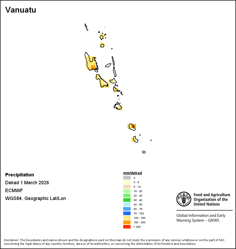 该图谱显示了每一旬(十天)的累积降水量。 所有非洲国家的降水量估算(除佛得角和毛里求斯外)均取自NOAA/FEWSNet,其他国家则取自ECMWF。