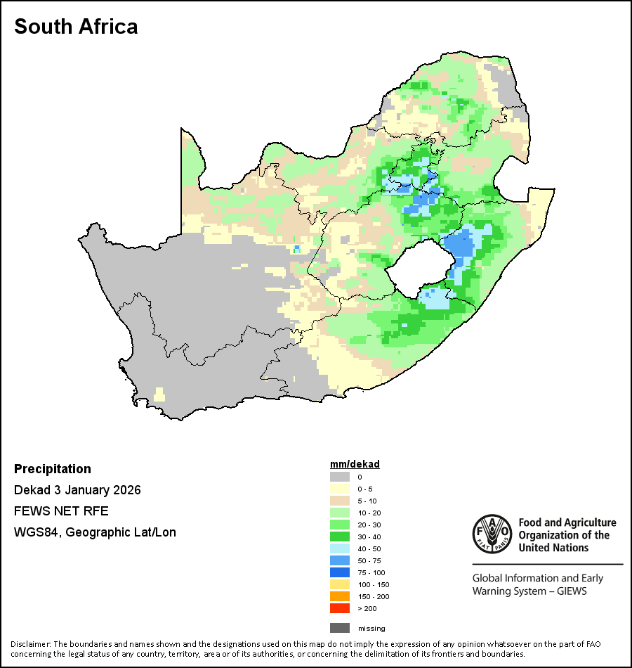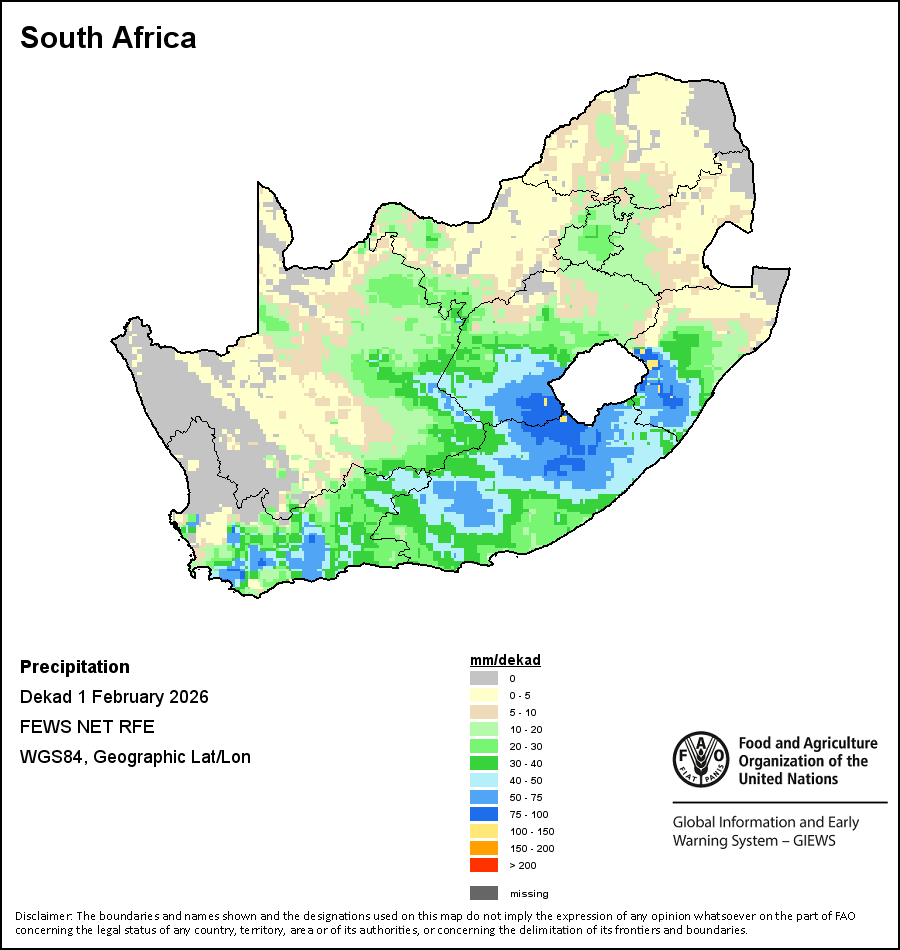La carte illustre les volumes cumulés de précipitations au cours d’une décade (une période de 10 jours). Les estimations concernant les précipitations pour tous les pays africains (à l'exception du Cap Vert et de Maurice) proviennent du NOAA/FEWSNet, tandis que les données concernant les autres pays sont obtenues à partir du CEPMMT.