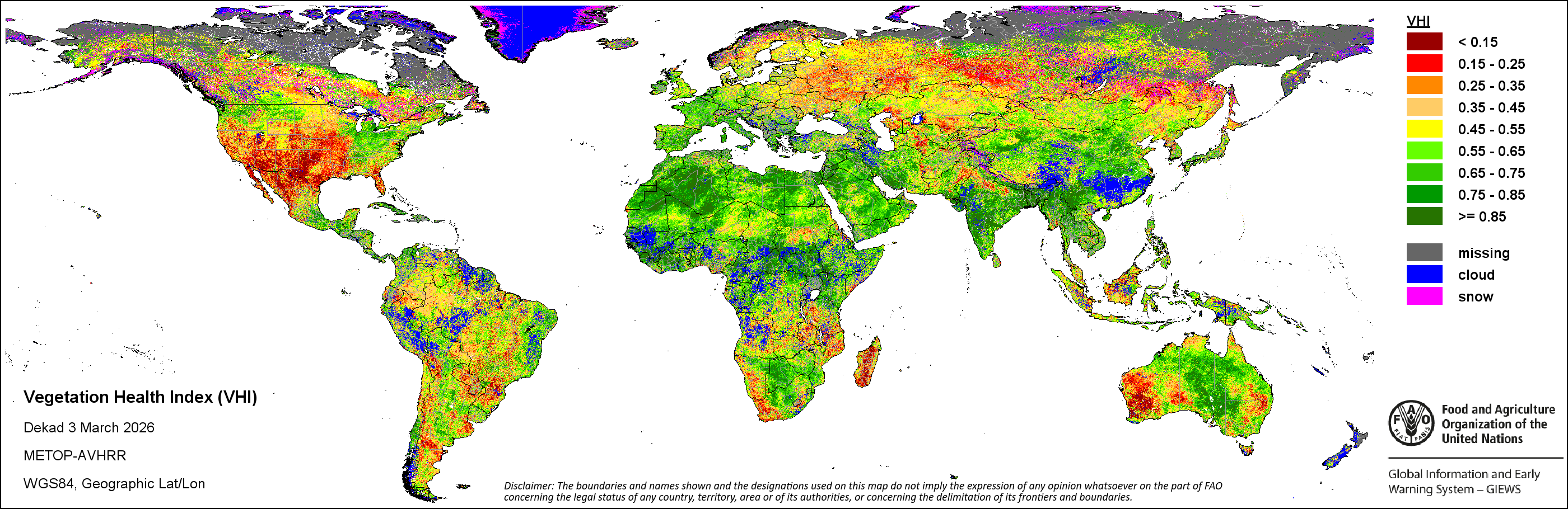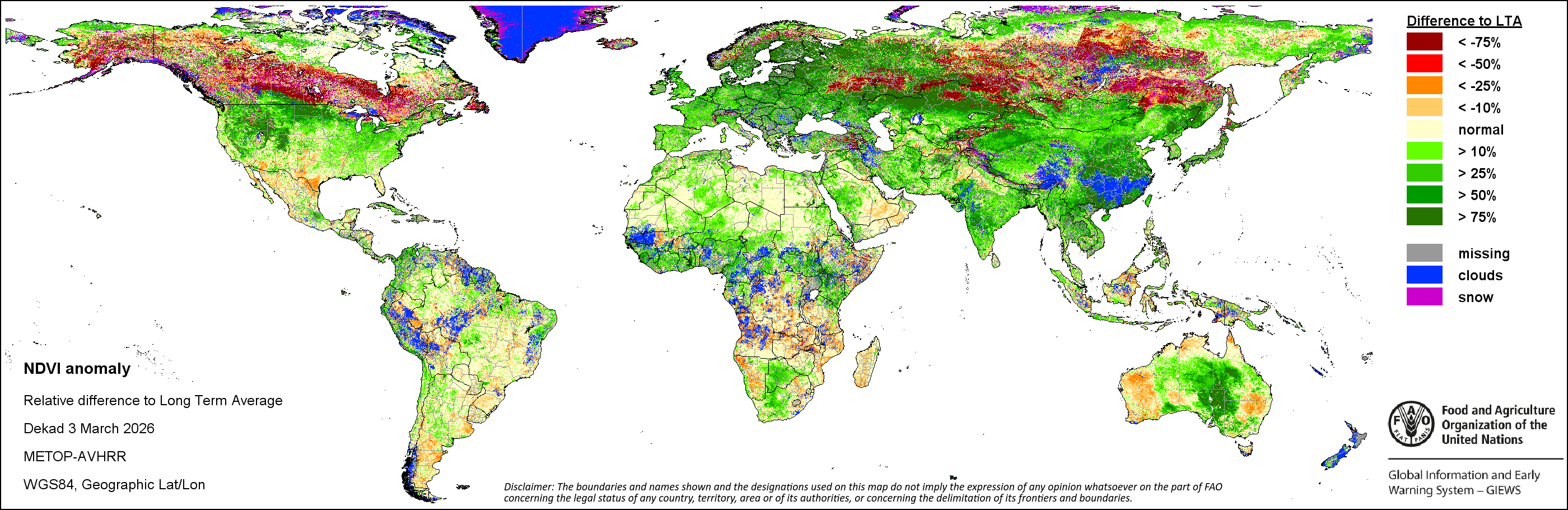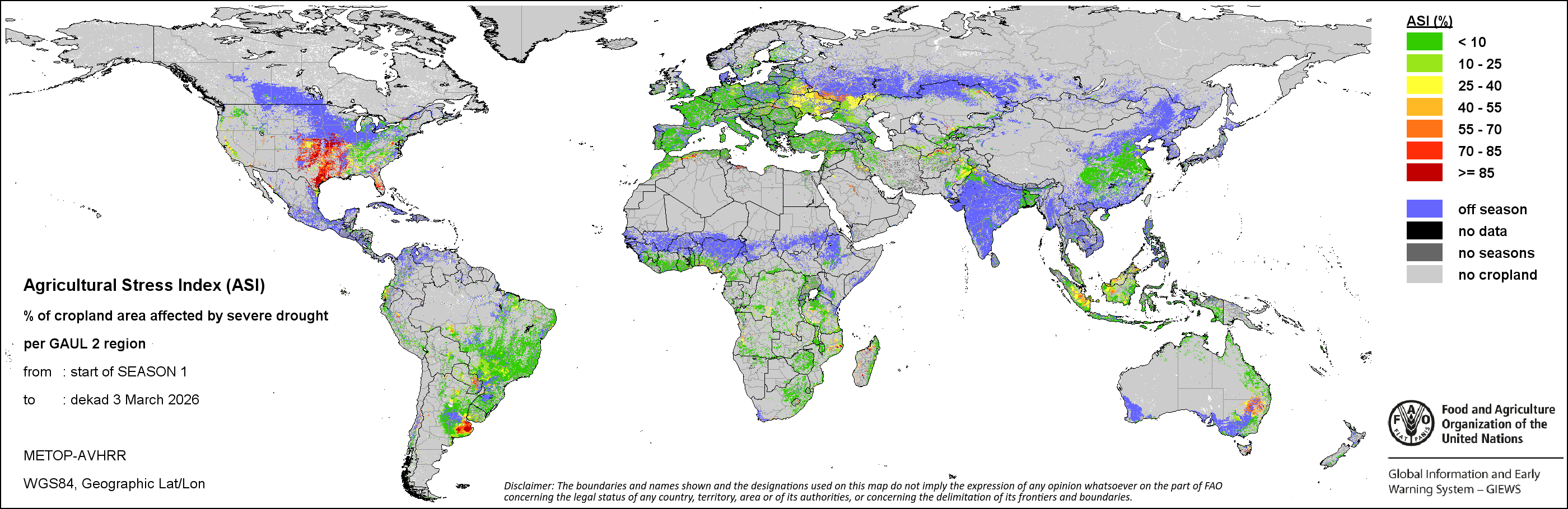 النظام العالمى للاعلام والانذار المبكر عن الأغذية والزراعة (GIEWS) رصد حالة المحاصيل الغذائية الأساسية عبر العالم لتقييم توقعات الإنتاج. دعماً لتحليل المعلومات المستندة إلى الأرض وتكميلها، يعمل النظام العالمي للمعلومات والإنذار المبكر على تسهيل بيانات الاستشعار عن بعد القادرة على توفير رؤية قيمة حول توافر المياه والصحة النباتية خلال المواسم الزراعية. وفضلاً عن إعطاء تقديرات حول الهطولات المطرية و شذوذ المؤشر الموحد لتباين الغطاء النباتي، قام النظام العالمي للمعلومات والإنذار المبكر بالتعاون مع شعبة المناخ والطاقة والحيازة لمنظمة الأغذية والزراعة بتطوير دليل الإجهاد الزراعي، وهو مؤشر من خلال نظرة سريعة لتحديد مبكر للمناطق الزراعية التي قد تكون متضررة بفعل موجات الجفاف أو القحط في الحالات المتطرفة.