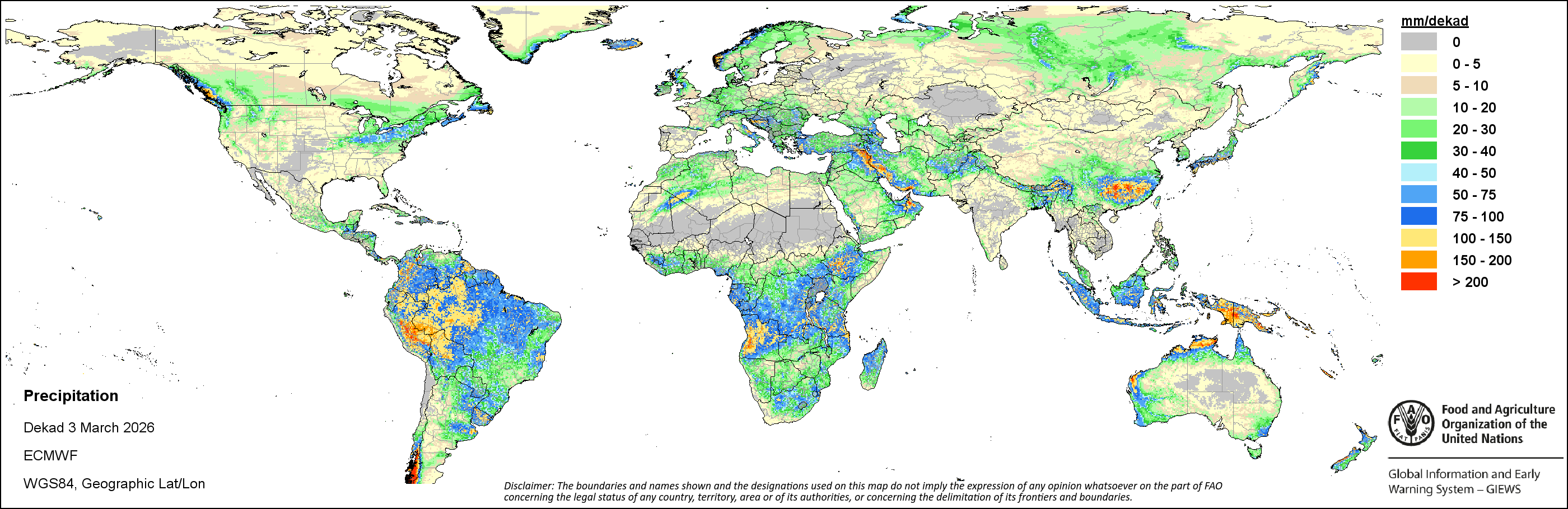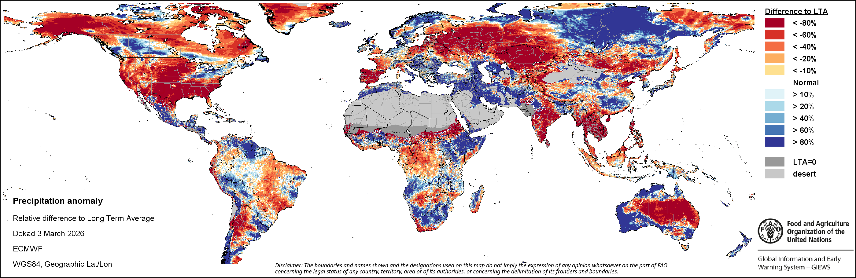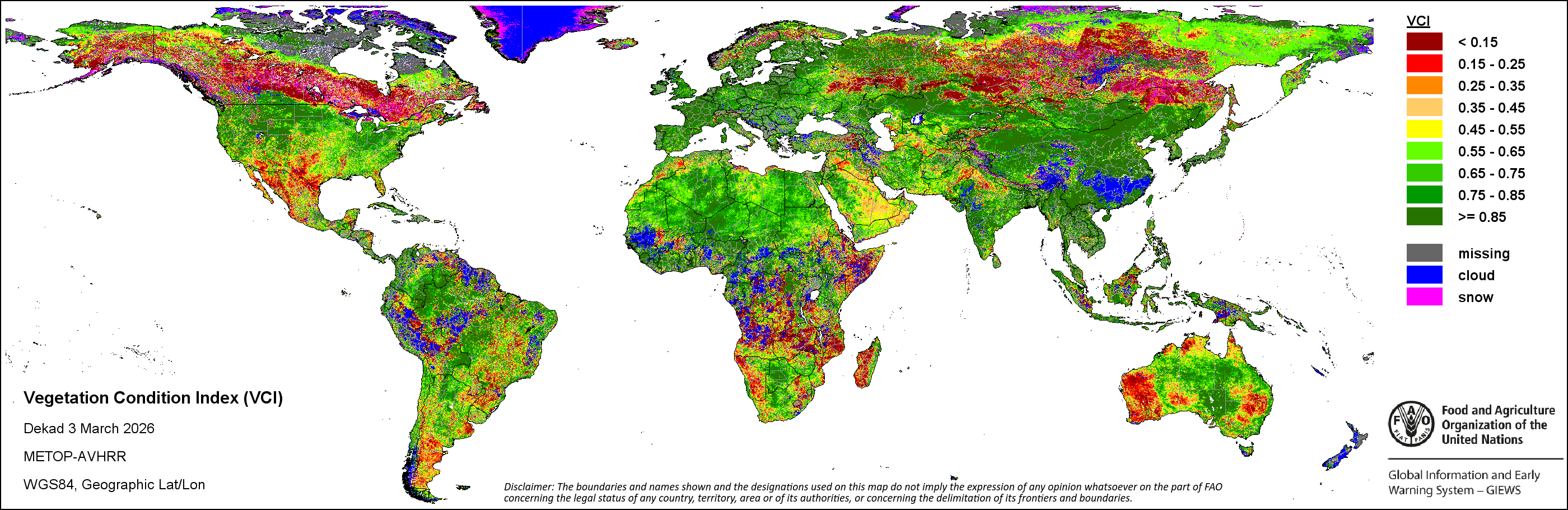 النظام العالمى للاعلام والانذار المبكر عن الأغذية والزراعة (GIEWS) رصد حالة المحاصيل الغذائية الأساسية عبر العالم لتقييم توقعات الإنتاج. دعماً لتحليل المعلومات المستندة إلى الأرض وتكميلها، يعمل النظام العالمي للمعلومات والإنذار المبكر على تسهيل بيانات الاستشعار عن بعد القادرة على توفير رؤية قيمة حول توافر المياه والصحة النباتية خلال المواسم الزراعية. وفضلاً عن إعطاء تقديرات حول الهطولات المطرية و شذوذ المؤشر الموحد لتباين الغطاء النباتي، قام النظام العالمي للمعلومات والإنذار المبكر بالتعاون مع شعبة المناخ والطاقة والحيازة لمنظمة الأغذية والزراعة بتطوير دليل الإجهاد الزراعي، وهو مؤشر من خلال نظرة سريعة لتحديد مبكر للمناطق الزراعية التي قد تكون متضررة بفعل موجات الجفاف أو القحط في الحالات المتطرفة.