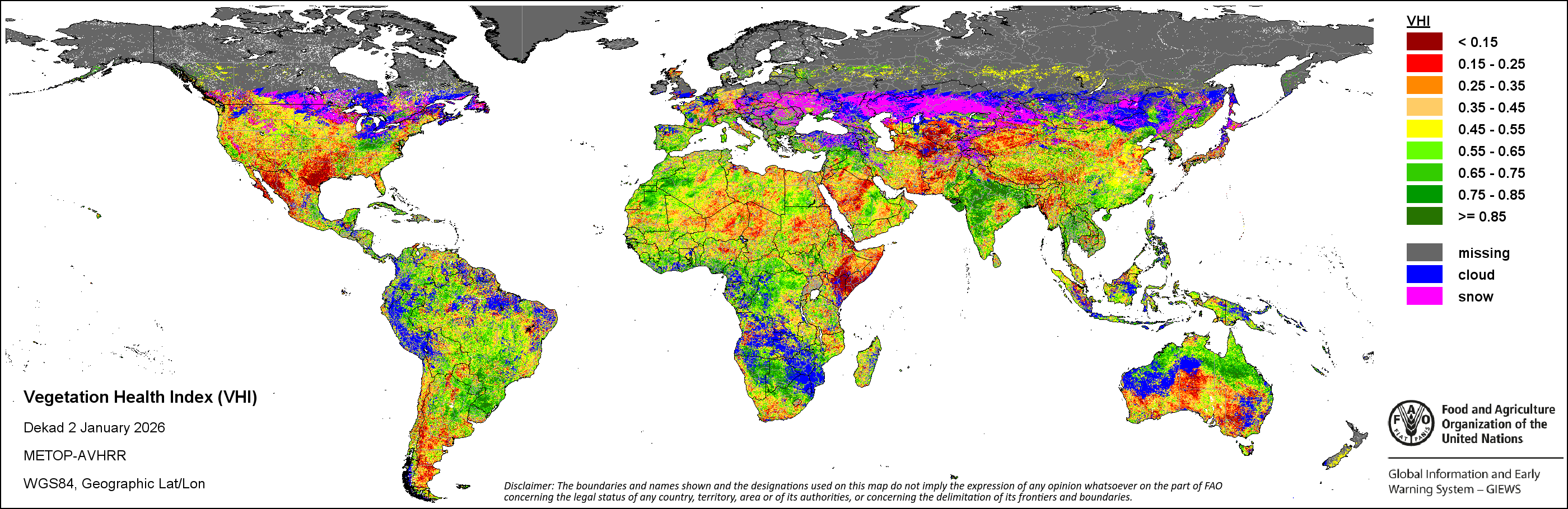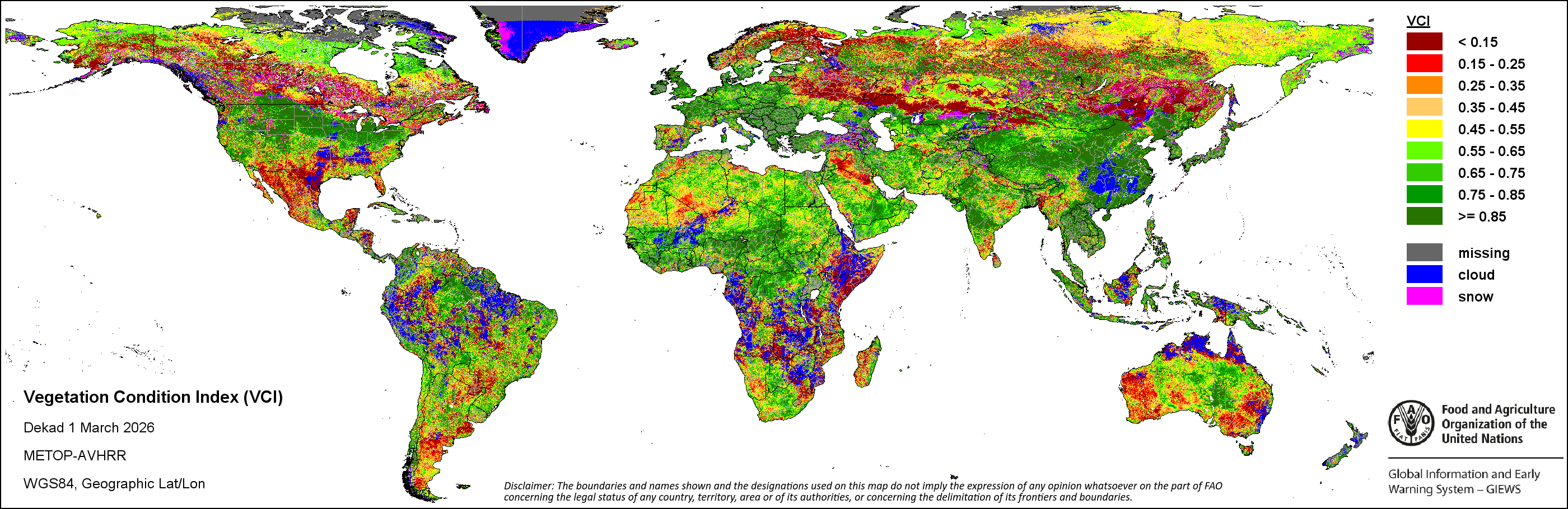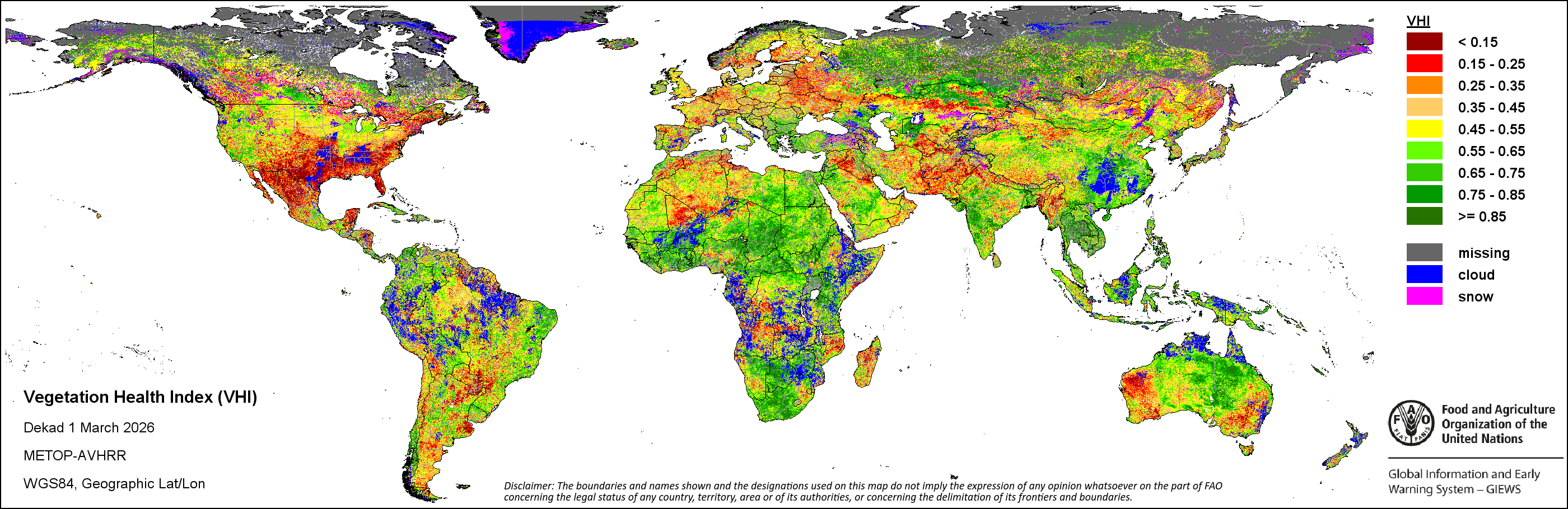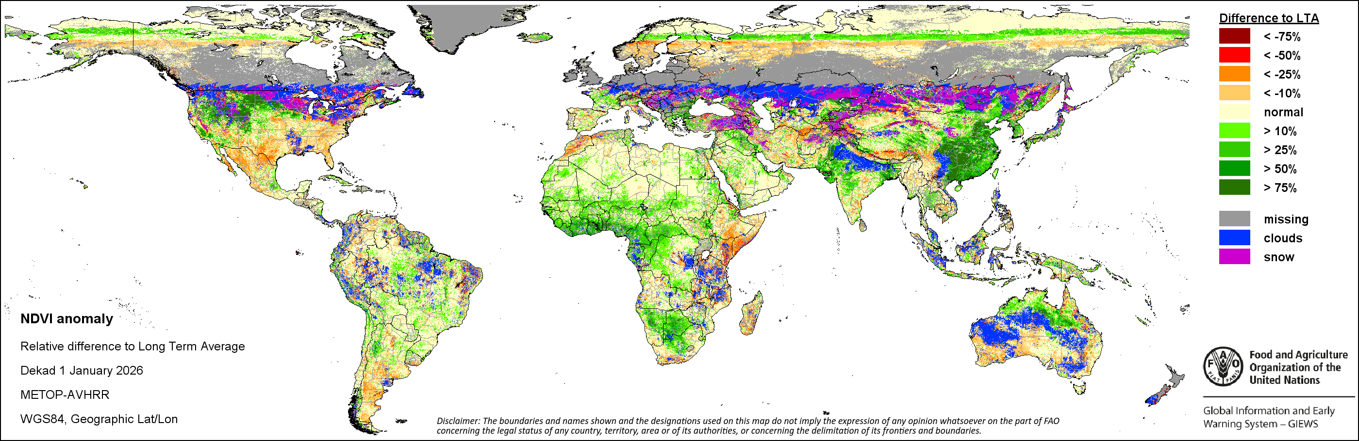 Global Information and Early Warning System on Food and Agriculture (GIEWS) monitors the condition of major foodcrops across the globe to assess production prospects. To support the analysis and supplement ground-based information, GIEWS utilizes remote sensing data that can provide a valuable insight on water availability and vegetation health during the cropping seasons. In addition to rainfall estimates and the Normalized Difference Vegetation Index (NDVI), GIEWS and FAO's OCB Division have developed the Agricultural Stress Index (ASI), a quick-look indicator for the early identification of agricultural areas probably affected by dry spells, or drought in extreme cases.