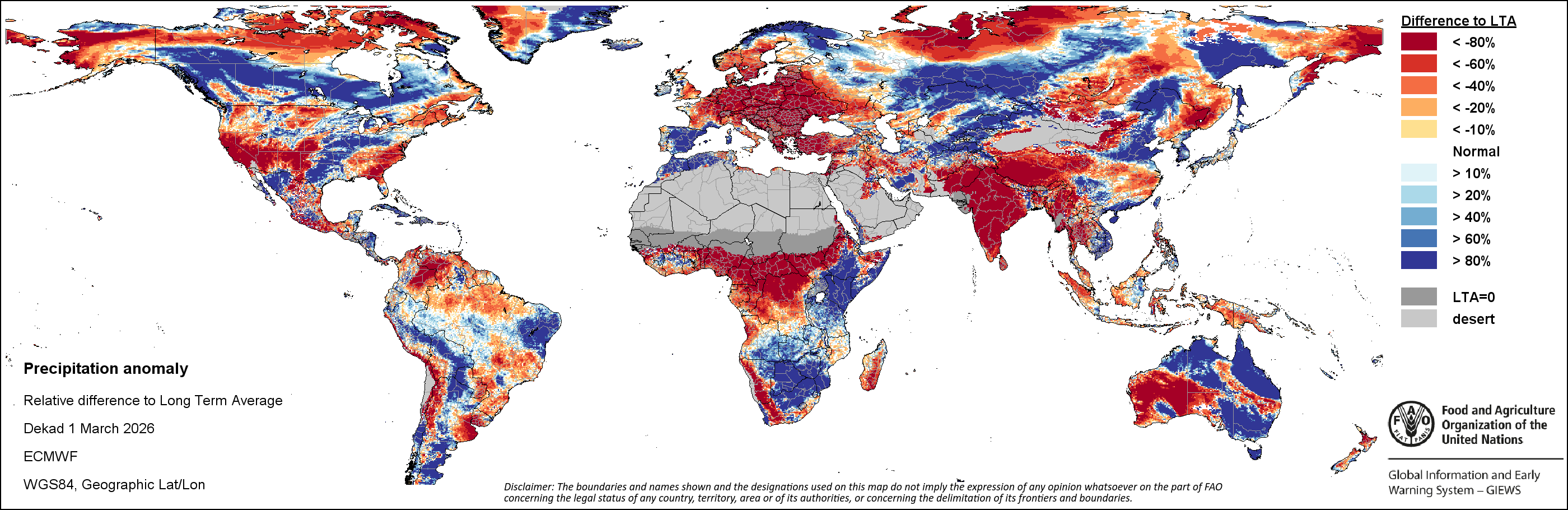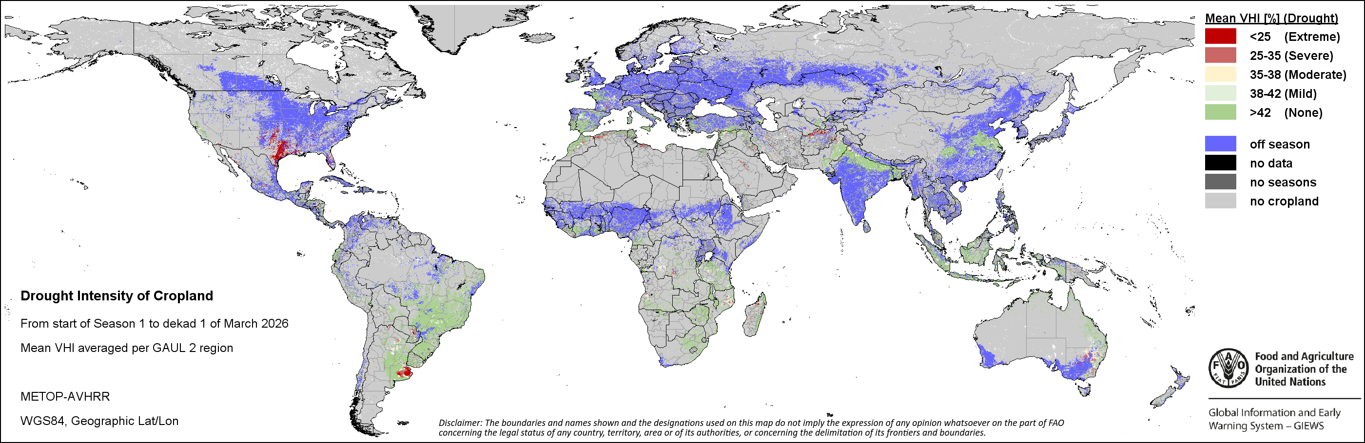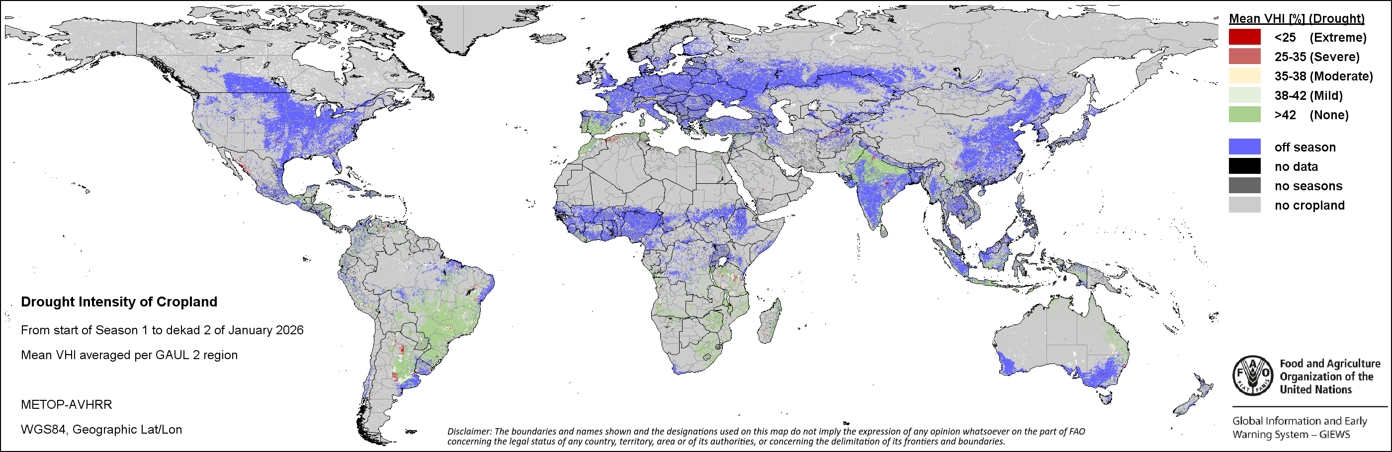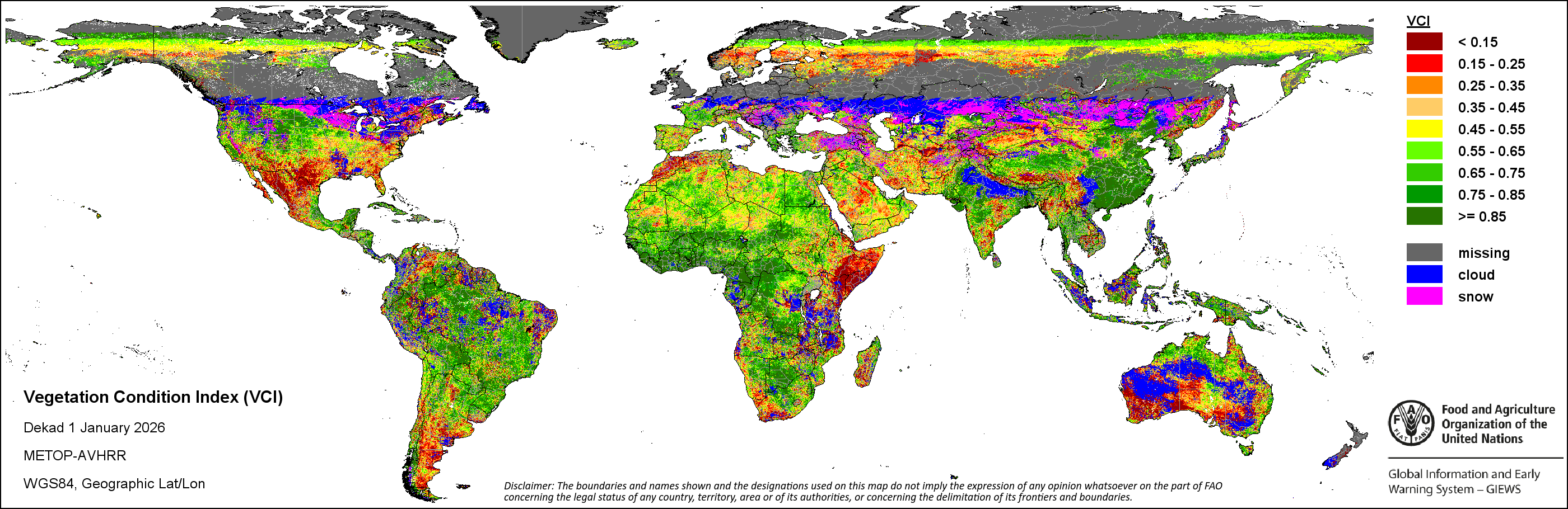 Global Information and Early Warning System on Food and Agriculture (GIEWS) monitors the condition of major foodcrops across the globe to assess production prospects. To support the analysis and supplement ground-based information, GIEWS utilizes remote sensing data that can provide a valuable insight on water availability and vegetation health during the cropping seasons. In addition to rainfall estimates and the Normalized Difference Vegetation Index (NDVI), GIEWS and FAO's OCB Division have developed the Agricultural Stress Index (ASI), a quick-look indicator for the early identification of agricultural areas probably affected by dry spells, or drought in extreme cases.