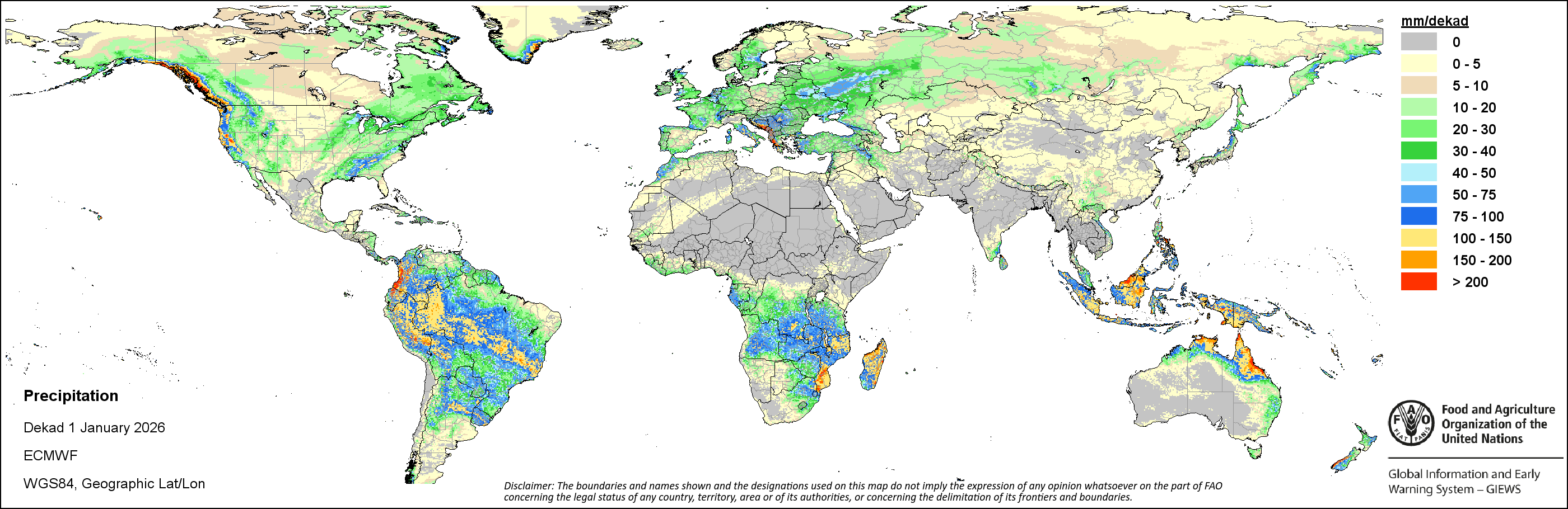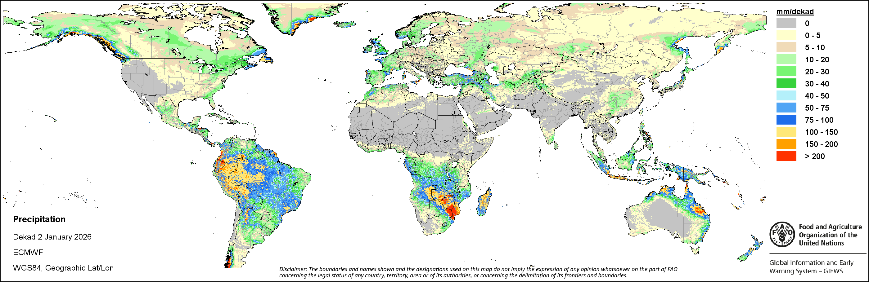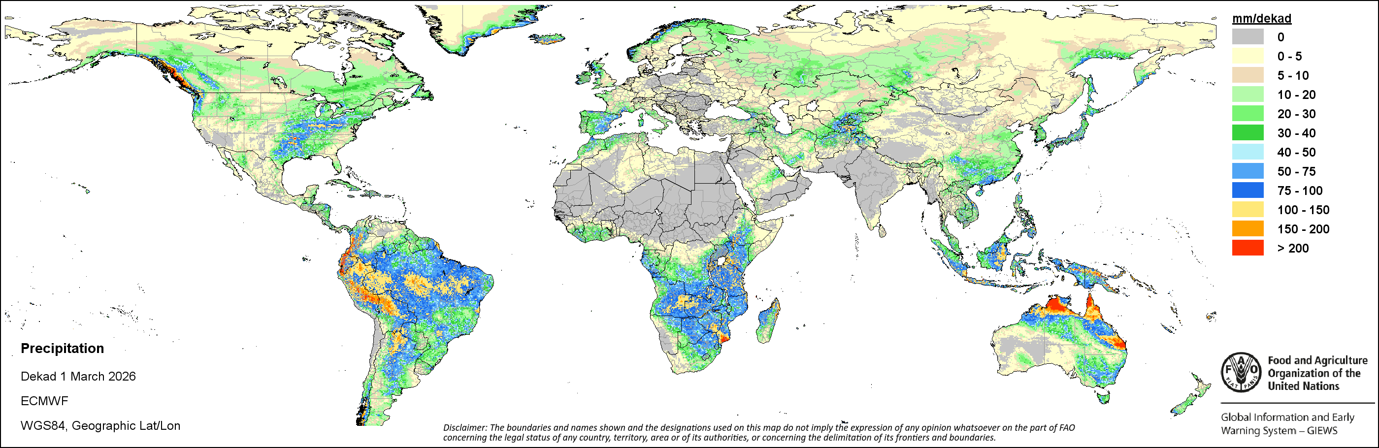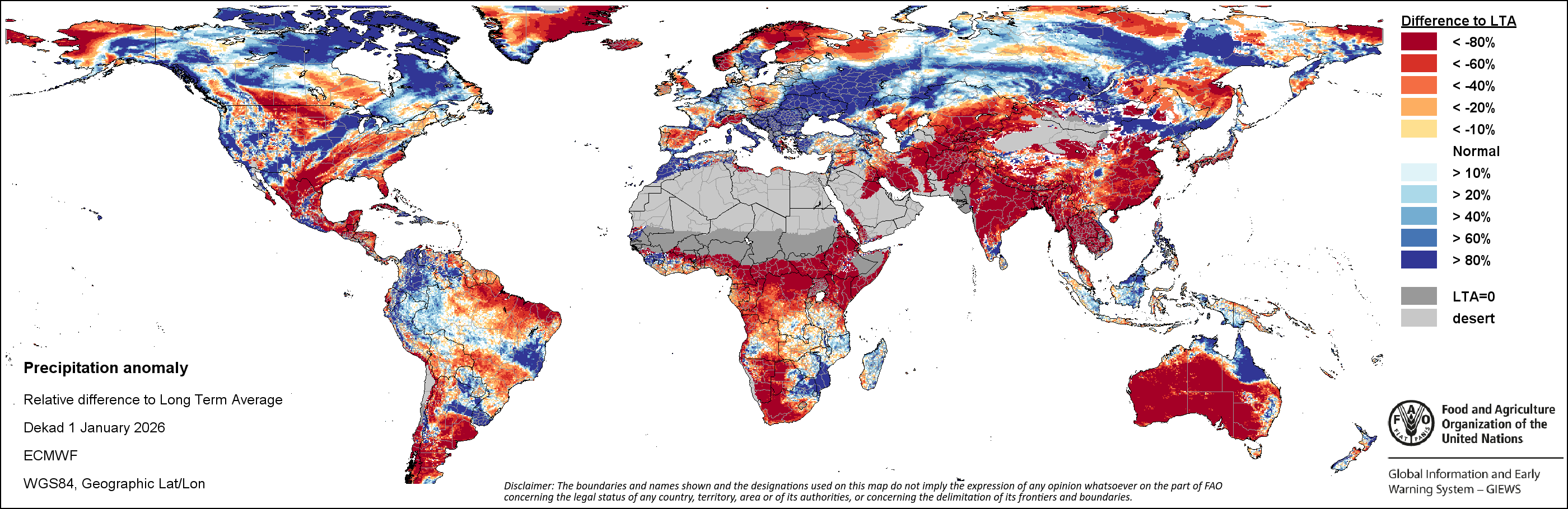 Global Information and Early Warning System on Food and Agriculture (GIEWS) monitors the condition of major foodcrops across the globe to assess production prospects. To support the analysis and supplement ground-based information, GIEWS utilizes remote sensing data that can provide a valuable insight on water availability and vegetation health during the cropping seasons. In addition to rainfall estimates and the Normalized Difference Vegetation Index (NDVI), GIEWS and FAO's OCB Division have developed the Agricultural Stress Index (ASI), a quick-look indicator for the early identification of agricultural areas probably affected by dry spells, or drought in extreme cases.