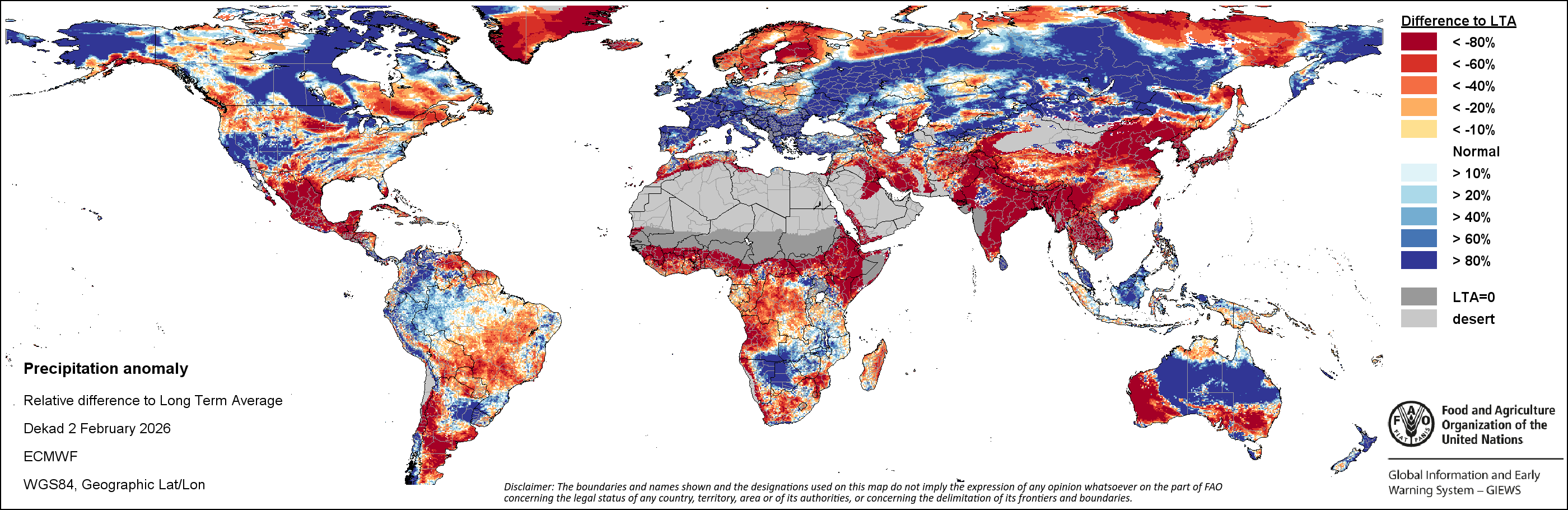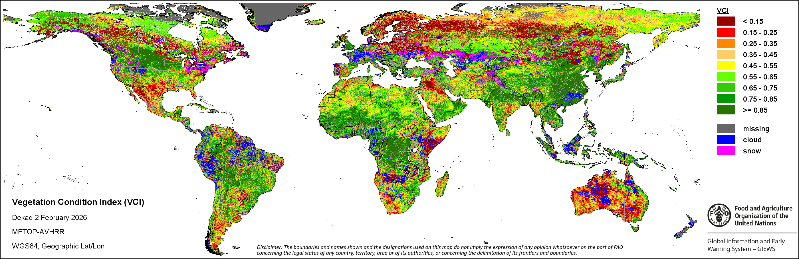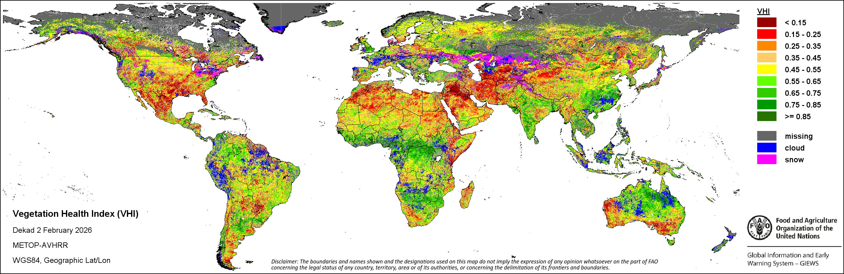 Глобальная система информации и раннего предупреждения по проблемам продовольствия и сельского хозяйства (GIEWS) служит для мониторинга состояния основных продовольственных культур по всему миру для оценки перспектив их производства. Для содействия анализу и дополнения к информации, полученной на местах, в Глобальной системе информации и раннего предупреждения по проблемам продовольствия и сельского хозяйства (GIEWS) используются данные дистанционного зондирования, благодаря которым может быть получена ценная информация о наличии воды и растительного покрова в течение сезонов урожая. В дополнение к оценкам атмосферных осадков и Усредненному индексу различий в растительном покрове (NDVI) GIEWS и Отдел OCB ФАО разработали Сельскохозяйственный стресс-индекс (ASI), оперативный показатель раннего выявления сельскохозяйственных зон, которые могут испытать засушливый период или, в крайнем случае, подвергнуться засухе.